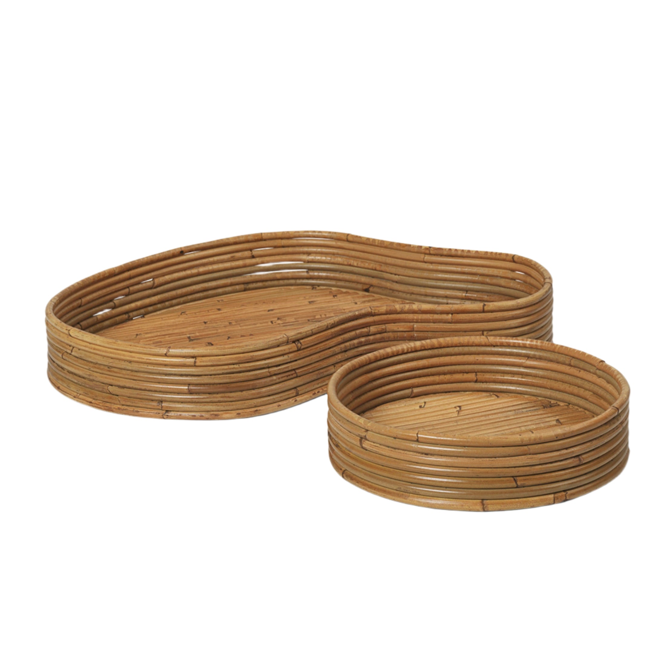 The Isola tray set is a blend of functionality and natural elegance. Handcrafted from dyed rattan, they delight with soft, organic shapes and a warm, natural finish. Two trays of different sizes and shapes are perfect for serving breakfast in bed, snacks in the garden, or as decorative elements to showcase your favorite items at home.