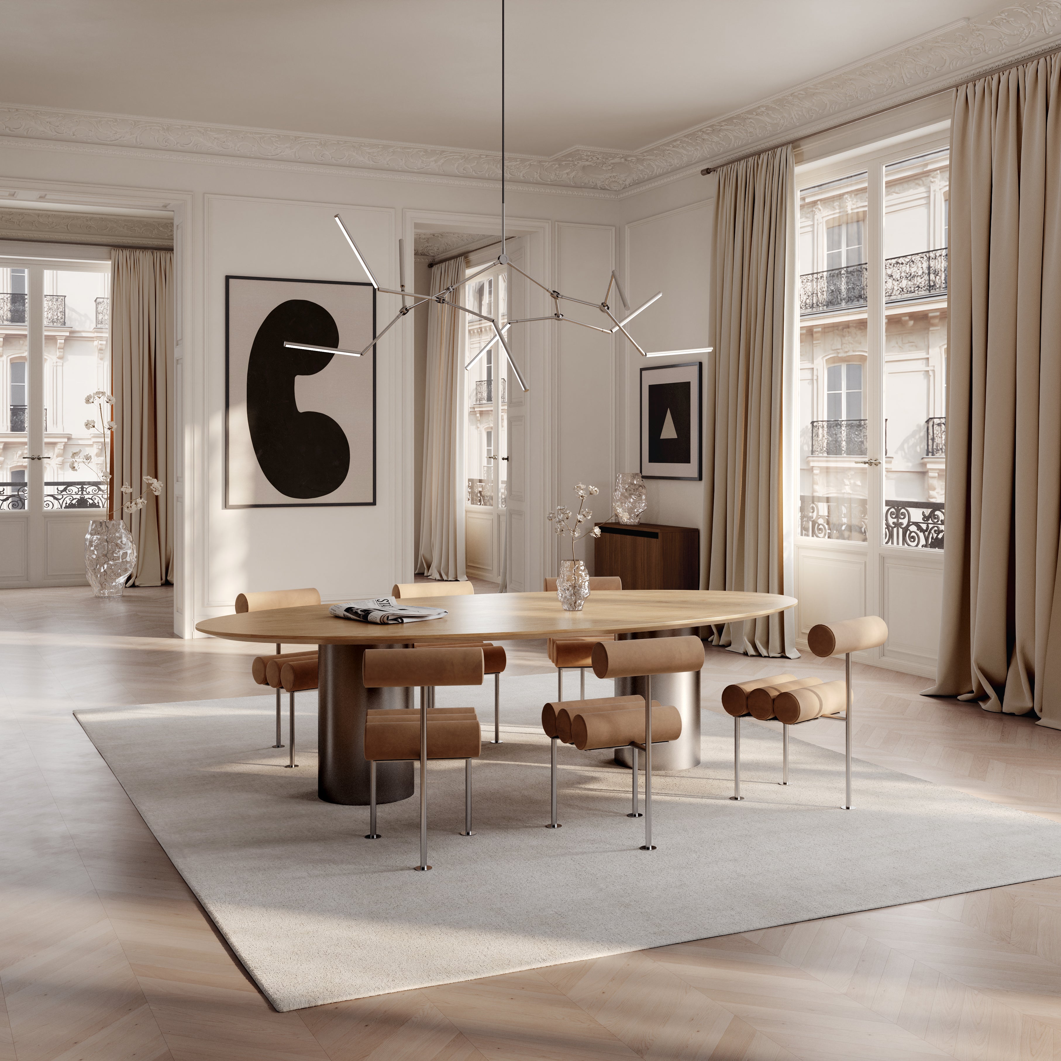 The chandelier Stick references the aesthetics of the 80s, yet instead of cold geometry, it offers a thoughtful, warm version of modernism. With the ability to position eight arms in various directions, the chandelier allows for the creation of individual compositions – from calm, harmonious lines to expressive, asymmetrical arrangements. It is perfect above a large table, as well as in a spacious living room or hallway, where the light not only brightens the space but also sets the mood and tells a story about style and form.