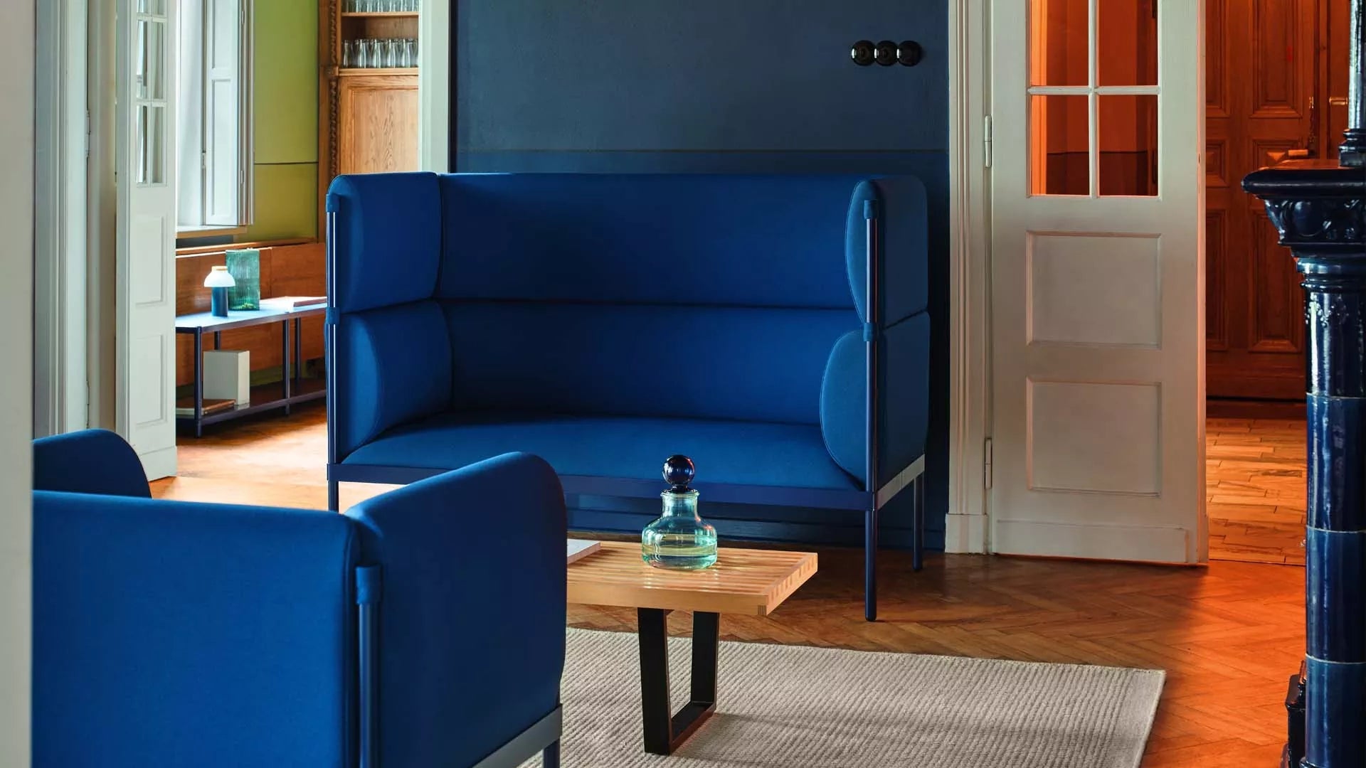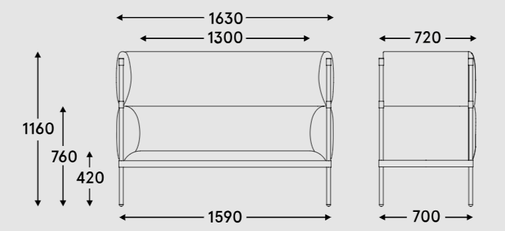 Sofa 2-sitzig Stilt mit hohem Rücken ist ein elegantes und funktionales Möbelstück, das ideal für Büros, Wohnräume, Hotels oder Restaurants ist. Der hohe Rücken bietet Komfort und schafft einen privaten Bereich, während der matte Rahmen in Kombination mit dem gepolsterten Sitz ein modernes, universelles Aussehen verleiht.