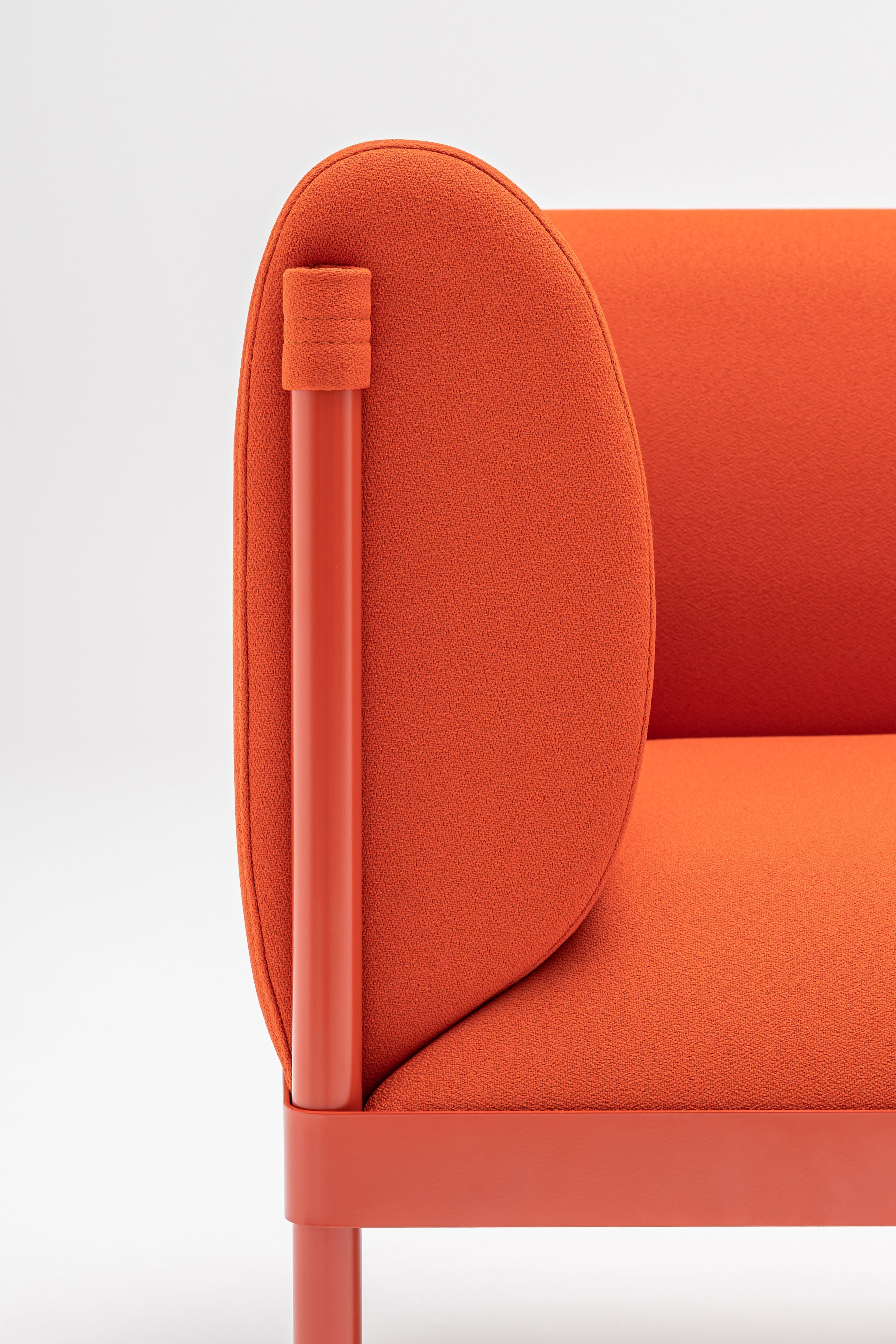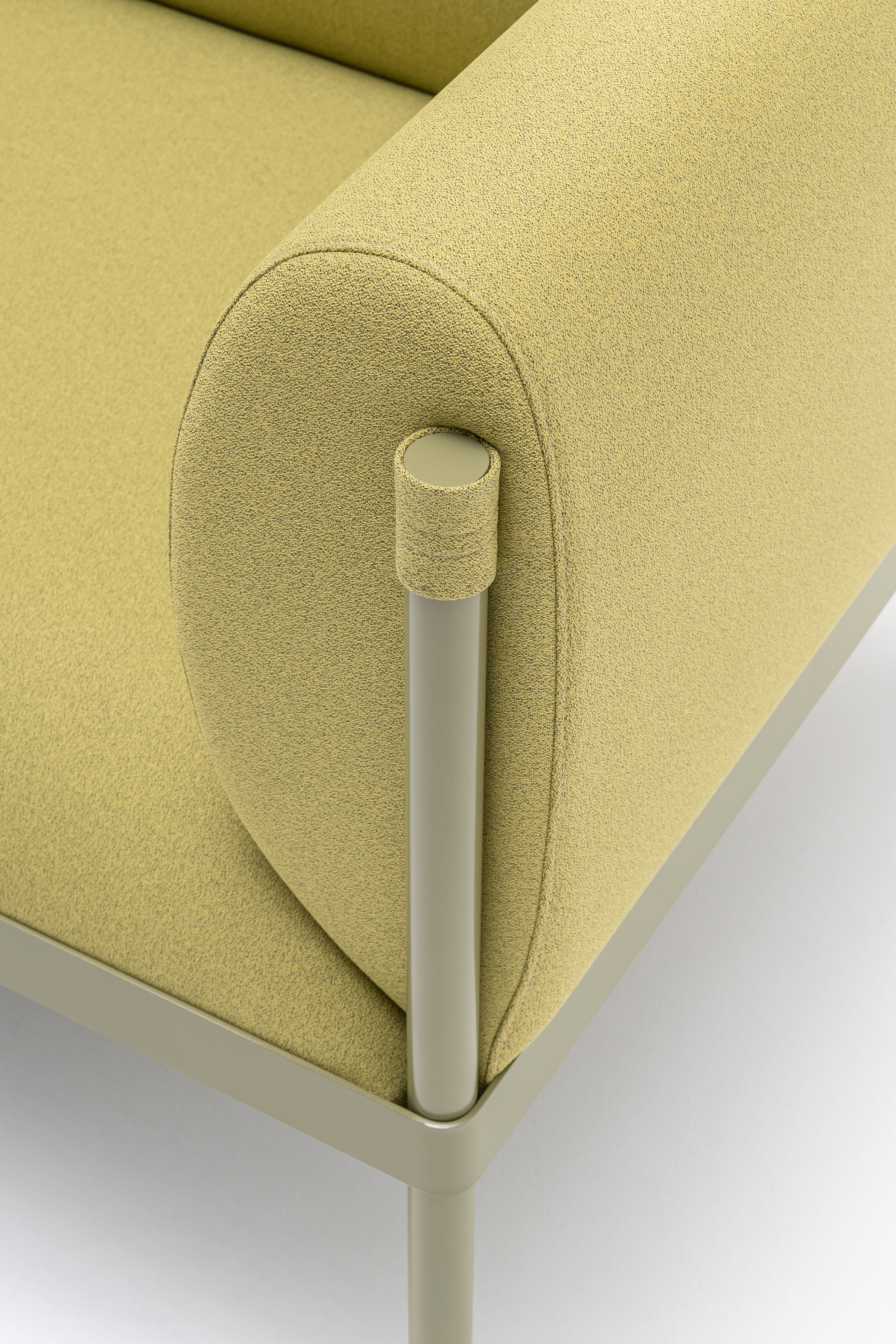 Die auf feste Spanplatten basierende Struktur stabilisiert die Rückenlehne und die Armlehnen, die eine halbprivate Zone für das Sitzen erzeugen. Hohe Beine erleichtern nicht nur das Sitzen und Aufstehen, sondern schützen den Boden auch dank Plastikfüßen vor Kratzern. Durch das elegante Finish der Rückseite des Sofas können Sie auf die Brennpunkte des Raums gesetzt werden, was dem Raum einen modernen Charakter verleiht.