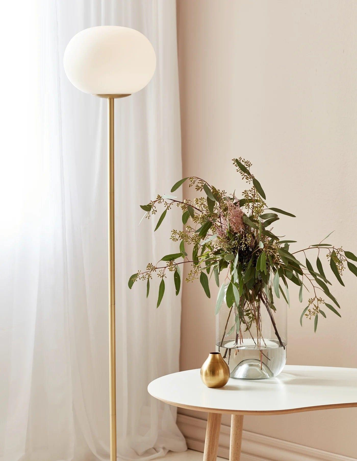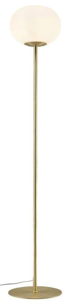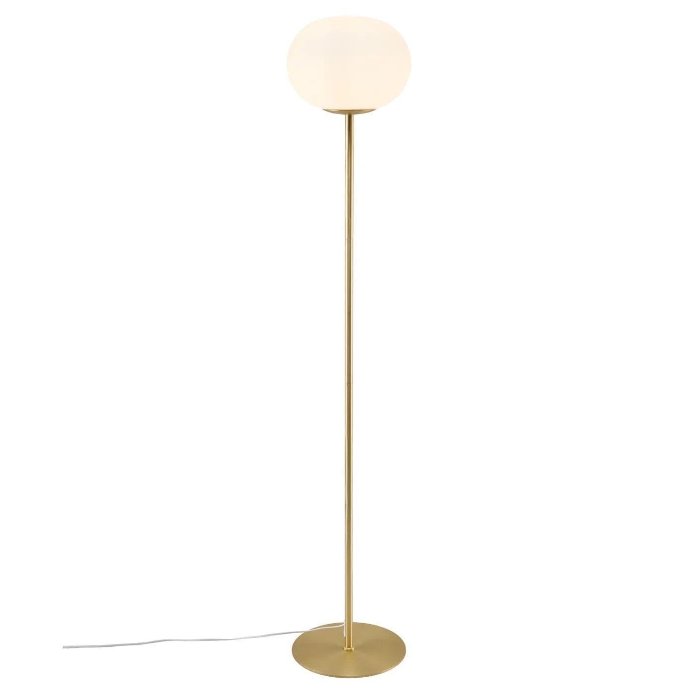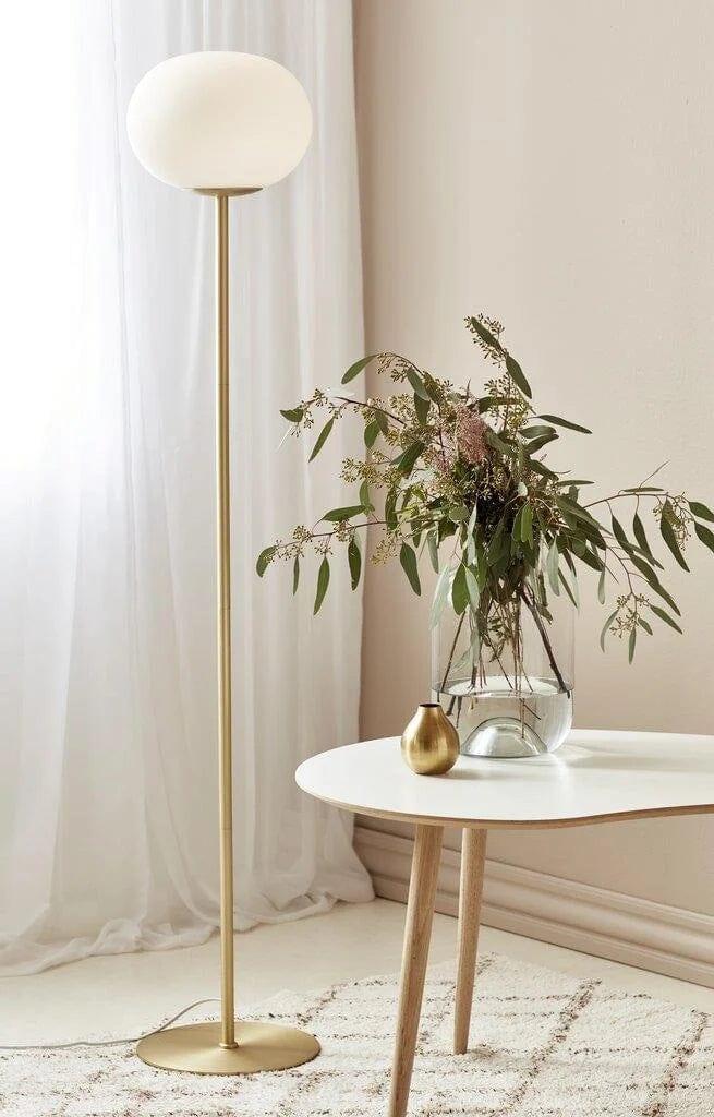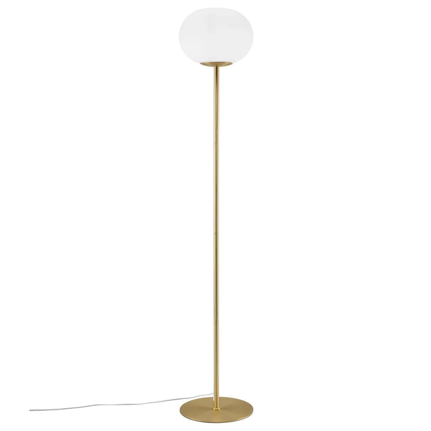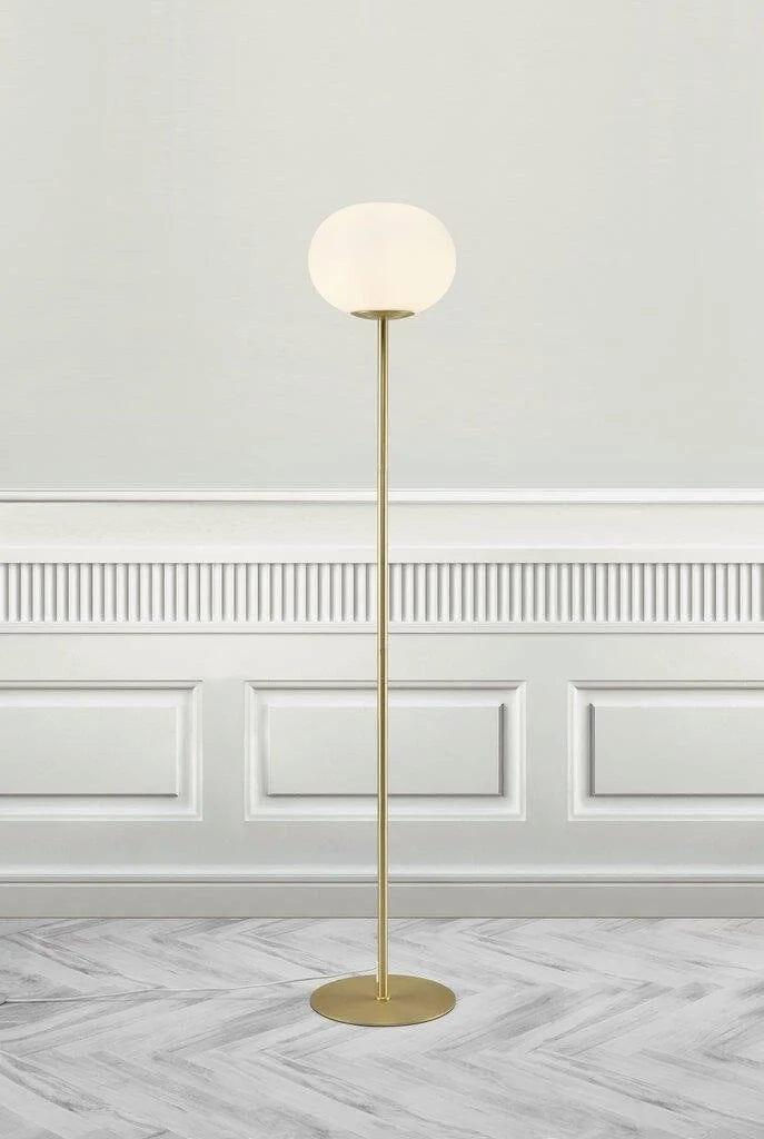 Bodenlampe Alton, die eine schöne Harmonie zwischen weißem Glas und der charmanten, abgerundeten Form des Sockels bietet, schafft ein elegantes Accessoire für das Wohnzimmer oder das Esszimmer. Die Kombination aus opalisierendem Glas und gebürstetem Messing erzeugt ein gemütliches und gleichzeitig modernes Design. Diese goldene Bodenlampe verleiht dem Raum ein zeitloses und raffiniertes Aussehen.
