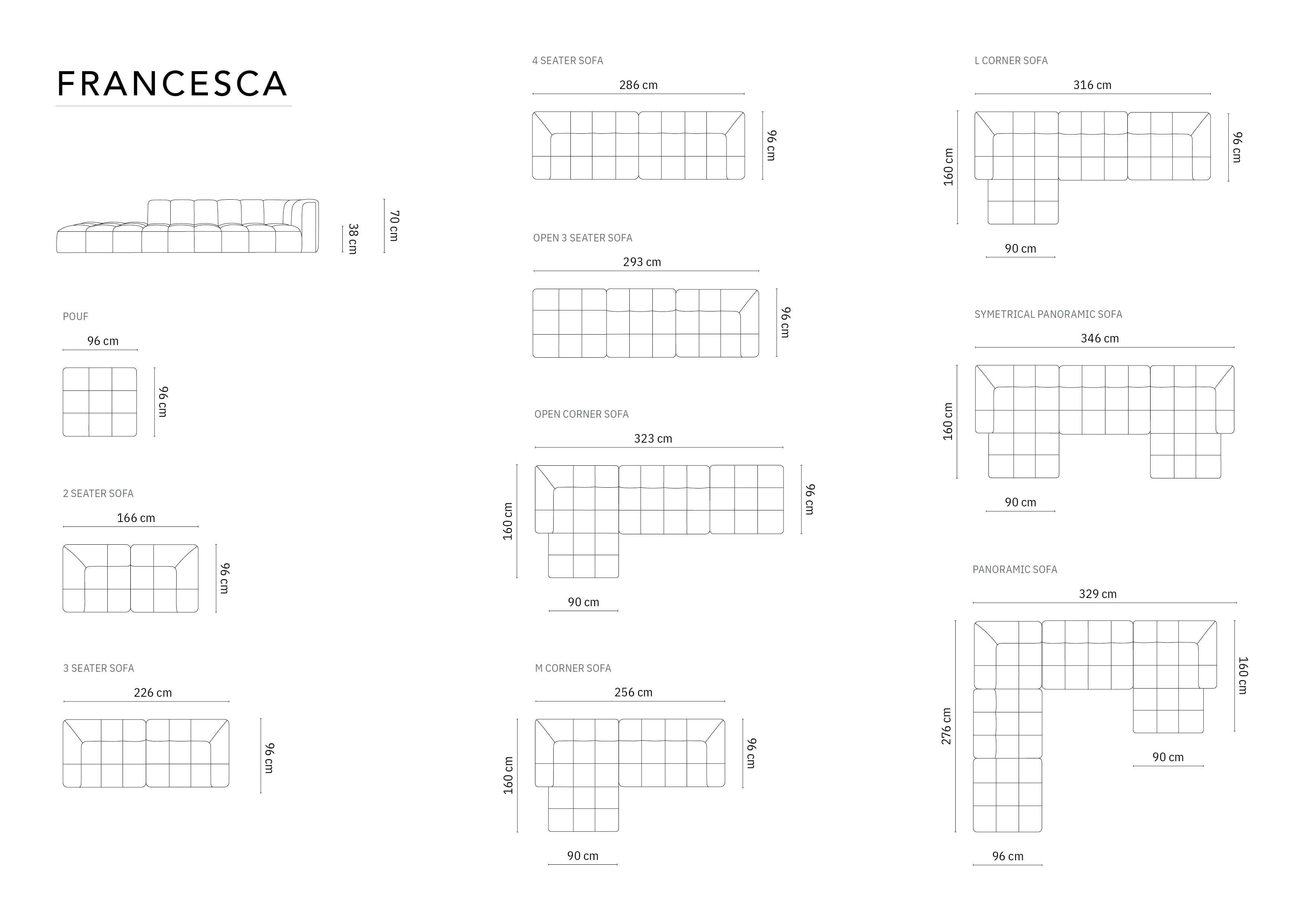 Achten Sie darauf, dass die Armlehnen mit zusätzlichen Angenahnen an der Vorderseite profilierte. Zusammen mit der Rückenlehne schaffen sie eine kohärente Unterstützung für Rücken und Schultern, in der Sie gerne entspannen. In der Francesca -Kollektion finden Sie verschiedene Kombinationen von Ecken, einfachen Panorama -Sofas oder Poufs, mit denen Sie die Möbel an Ihre Sicht anpassen können.