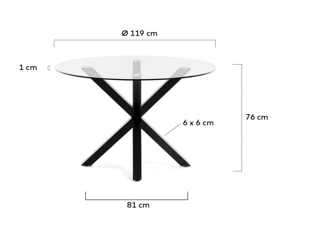 Runder Tisch Argo mit Glasplatte und schwarzem Fuß ist eine außergewöhnliche Kombination aus Eleganz, Modernität und Funktionalität. Sein einzigartiger Fuß mit sich kreuzenden Stahlbeinen sorgt für Stabilität und verleiht dem Gesamtbild gleichzeitig einen raffinierten Charakter. Dank der mattschwarzen Oberfläche werden die Beine zu einem subtilen Akzent, der perfekt mit dem restlichen Interieur harmoniert.