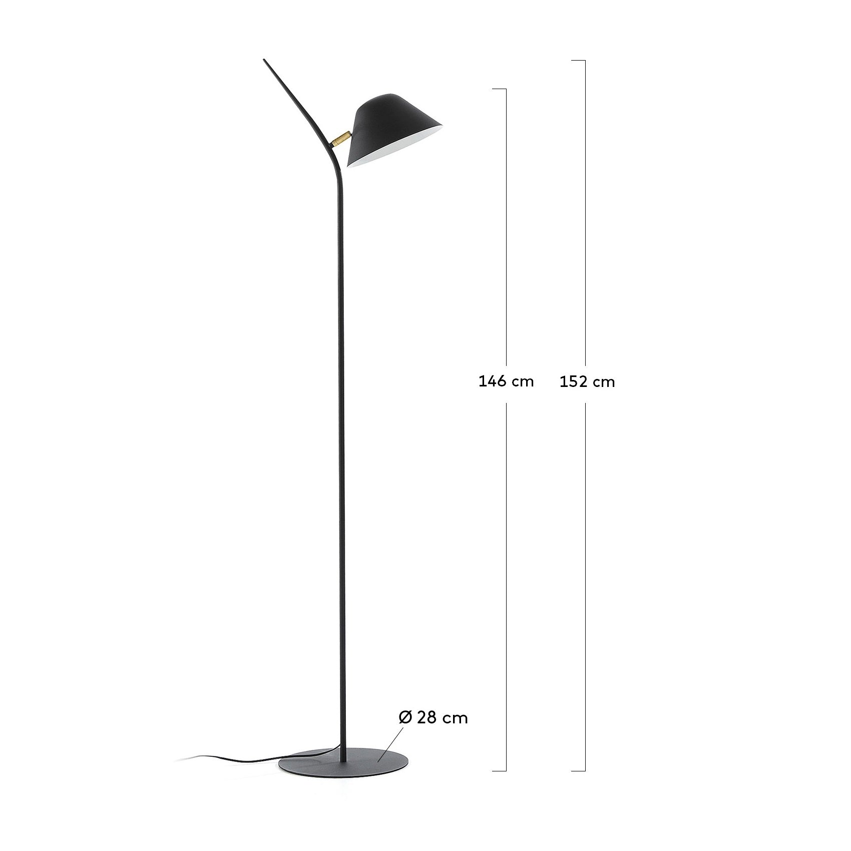 Die Aurelia -Stehlampe wurde ausschließlich aus bemalten Stahl mit mattem schwarzem Finish und einem kleinen goldenen Detail hergestellt. Die runde Basis sorgt für die Stabilität, und der artikulierte Lampenschirm ermöglicht es Ihnen, das Licht zu fokussieren, wo Sie möchten.