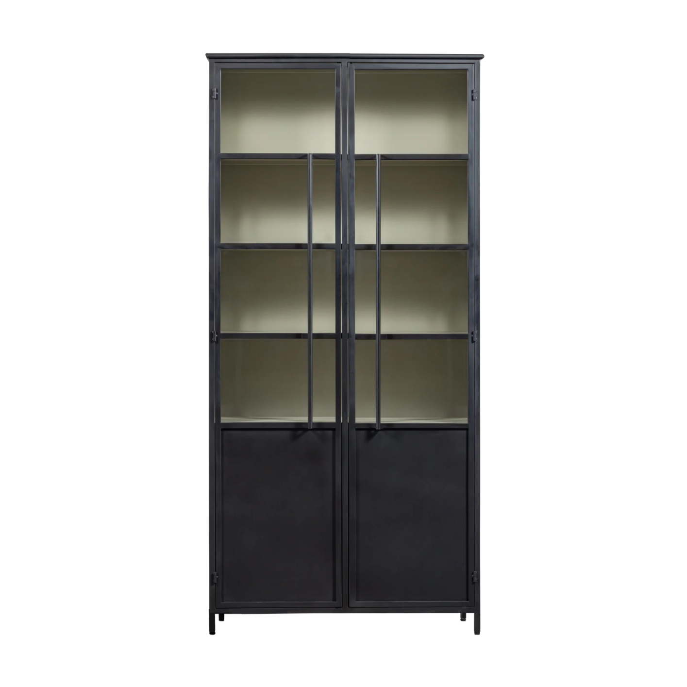 Die metallene Vitrine ist eine solide, moderne Ausstellungsfläche, die sich hervorragend als funktionale Präsentation im Wohnzimmer, Esszimmer oder Büro eignet. Sie besteht vollständig aus Metall und ist mit einer trendigen, matten Pulverbeschichtung versehen, die Langlebigkeit, Eleganz und Widerstandsfähigkeit gegen den täglichen Gebrauch gewährleistet. Die verglasten Türen und die Metallregale bieten viel Platz für Dekorationen, Bücher oder Keramiken.