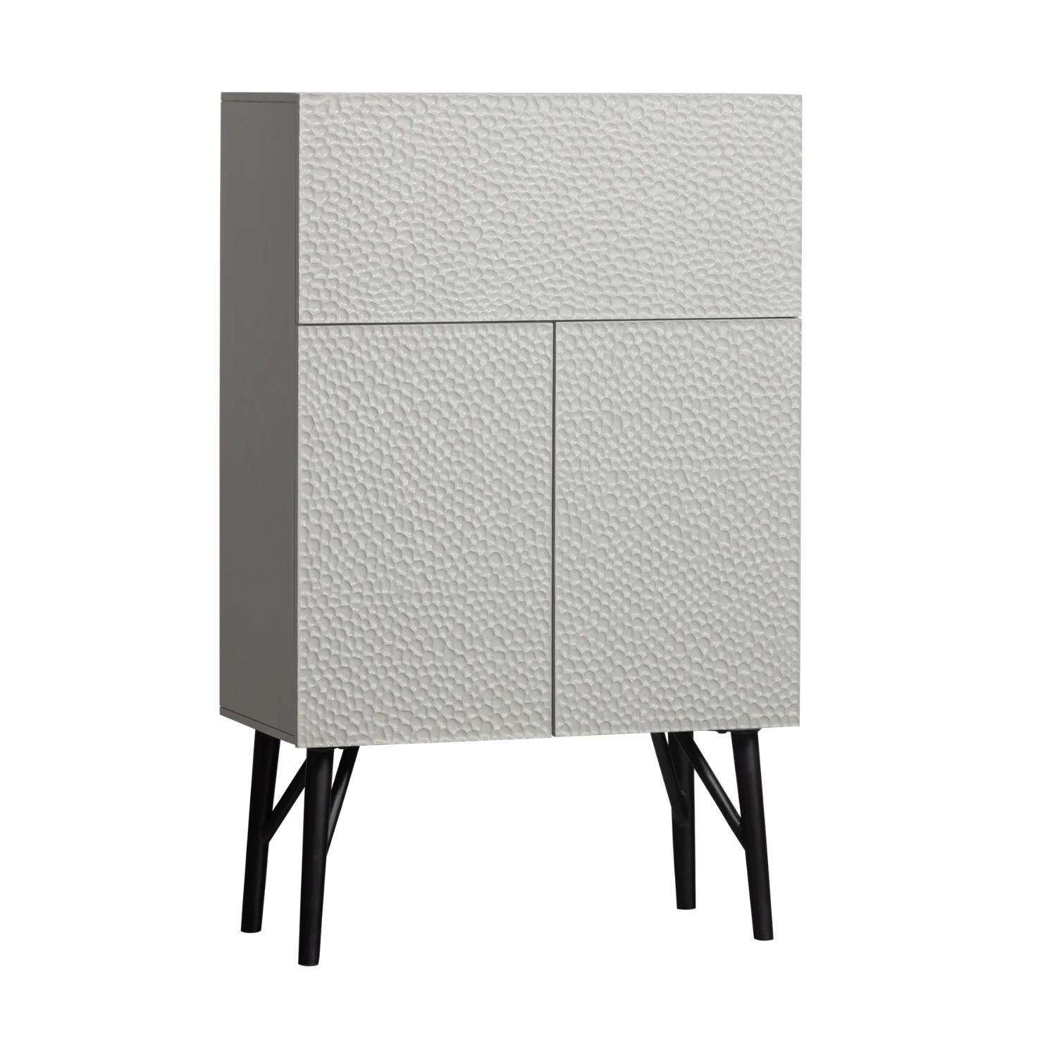 Bar Geschnitzt ist ein ausdrucksstarker Vorschlag, Ihre Lieblingsgetränke und Glas zu lagern und anzuzeigen. Die geschnitzte Kollektion zeichnet sich durch ein spektakuläres grafisches Muster an den Fronten aus, das von orientalischer skulpturaler Kunst inspiriert ist. Jede Front ähnelt einer Miniatur -Wüstenlandschaft, und der zarte Nebelschatten verleiht dem Ganzen einen eleganten und ruhigen Charakter.