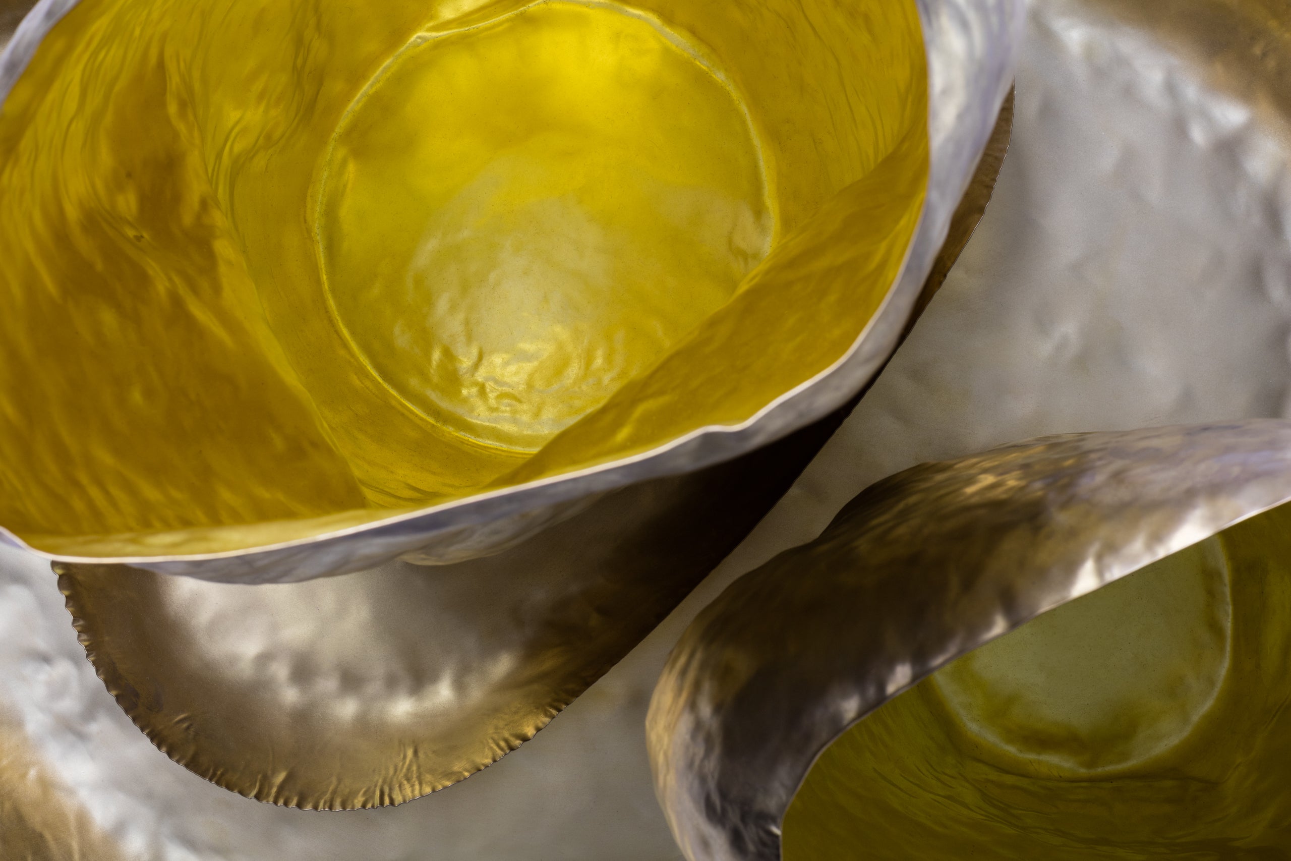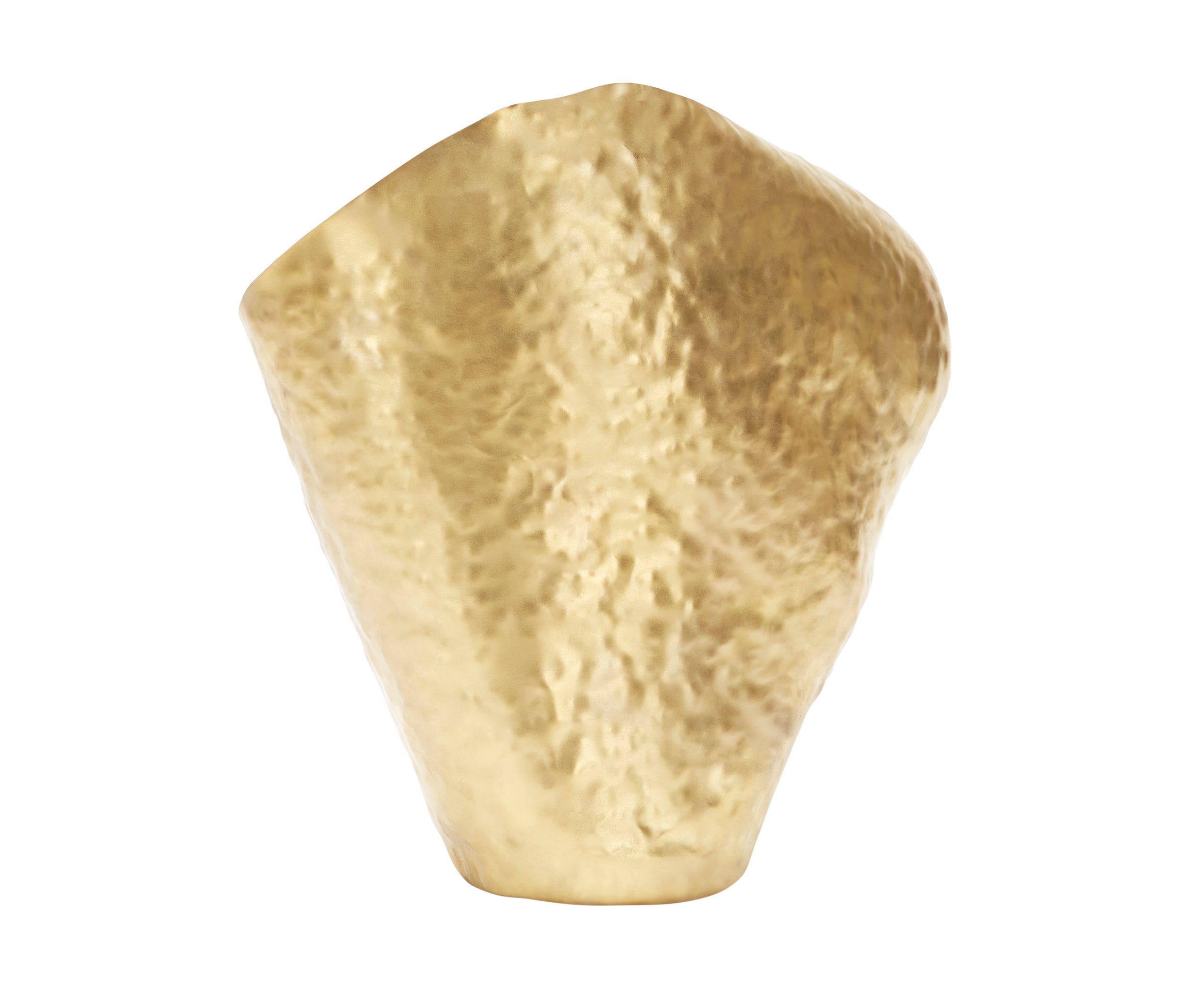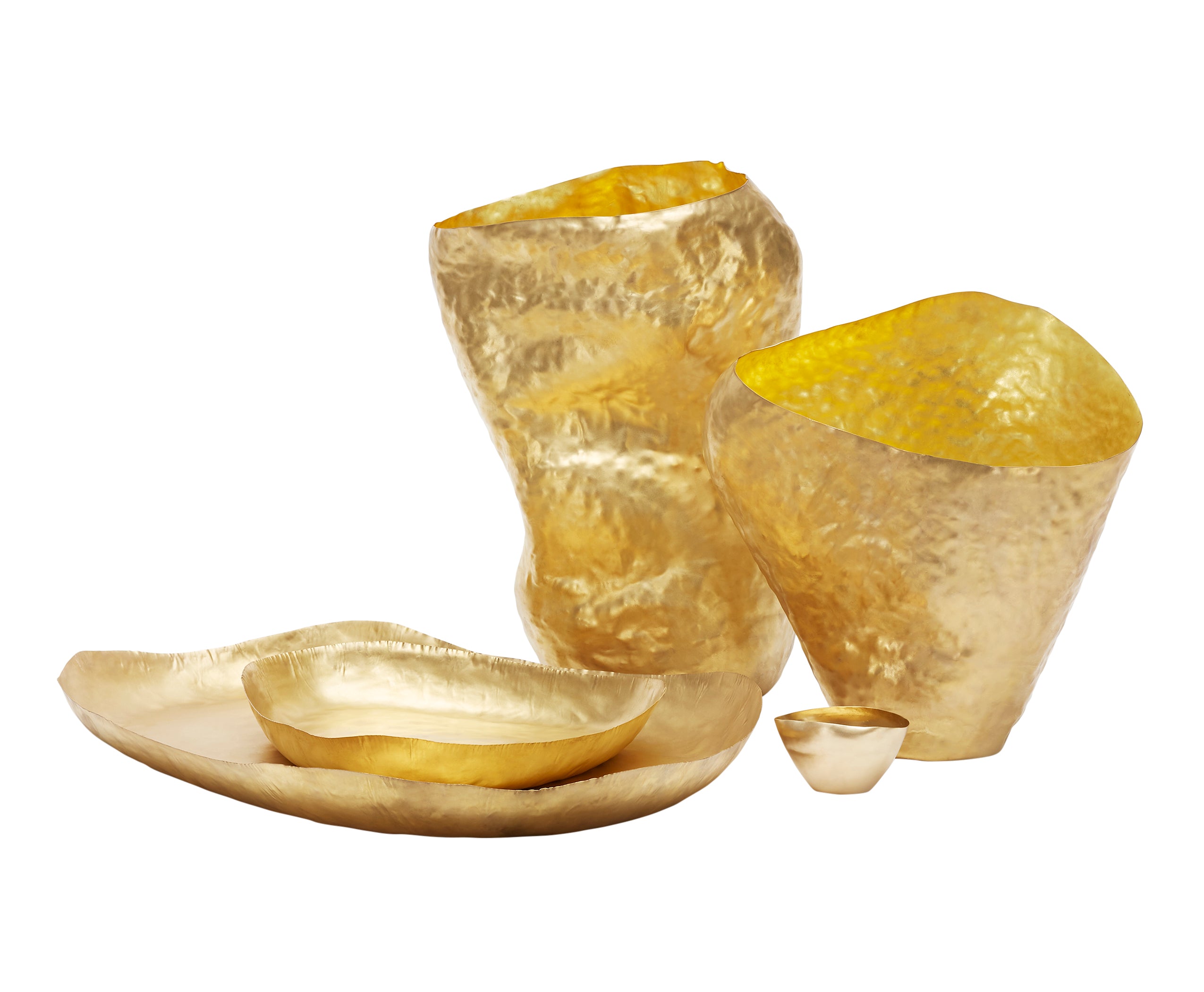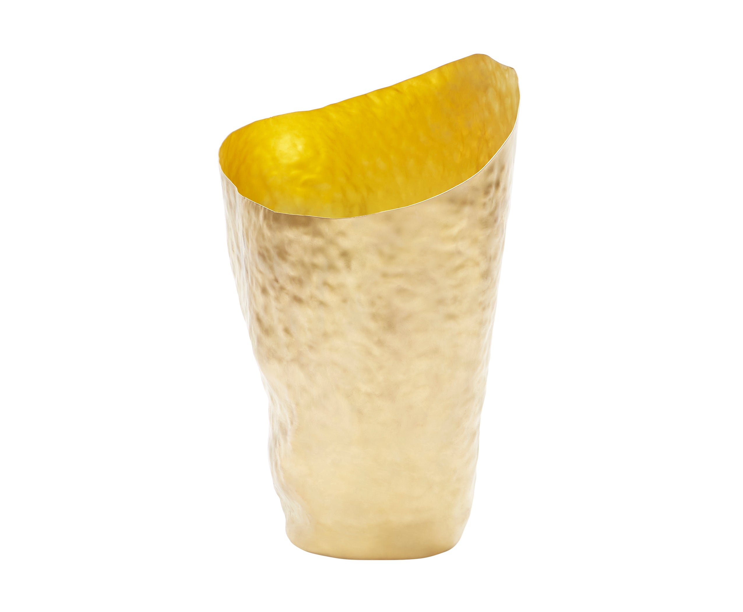 Misa Bash ist ein einzigartiges, handgeschmiedetes Gefäß, das Funktionalität und dekorativen Charakter vereint. Jedes Exemplar ist einzigartig, dank der handwerklichen Herstellung aus gehärtetem Messing, was ihm ein unverwechselbares Aussehen und rohe Eleganz verleiht.