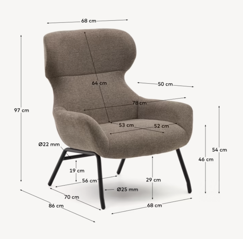 Die Stahlbeine mit schwarzem Finish verleihen dem hellbraunen Sessel nicht nur einen modernen Charakter, sondern sorgen auch für Stabilität und Langlebigkeit. Solche Details unterstreichen die hohe Qualität von Belina und machen sie nicht nur zu einem Ort der Entspannung, sondern auch zu einem dekorativen Element, das das Interieur mit ihrem einzigartigen Design bereichert.