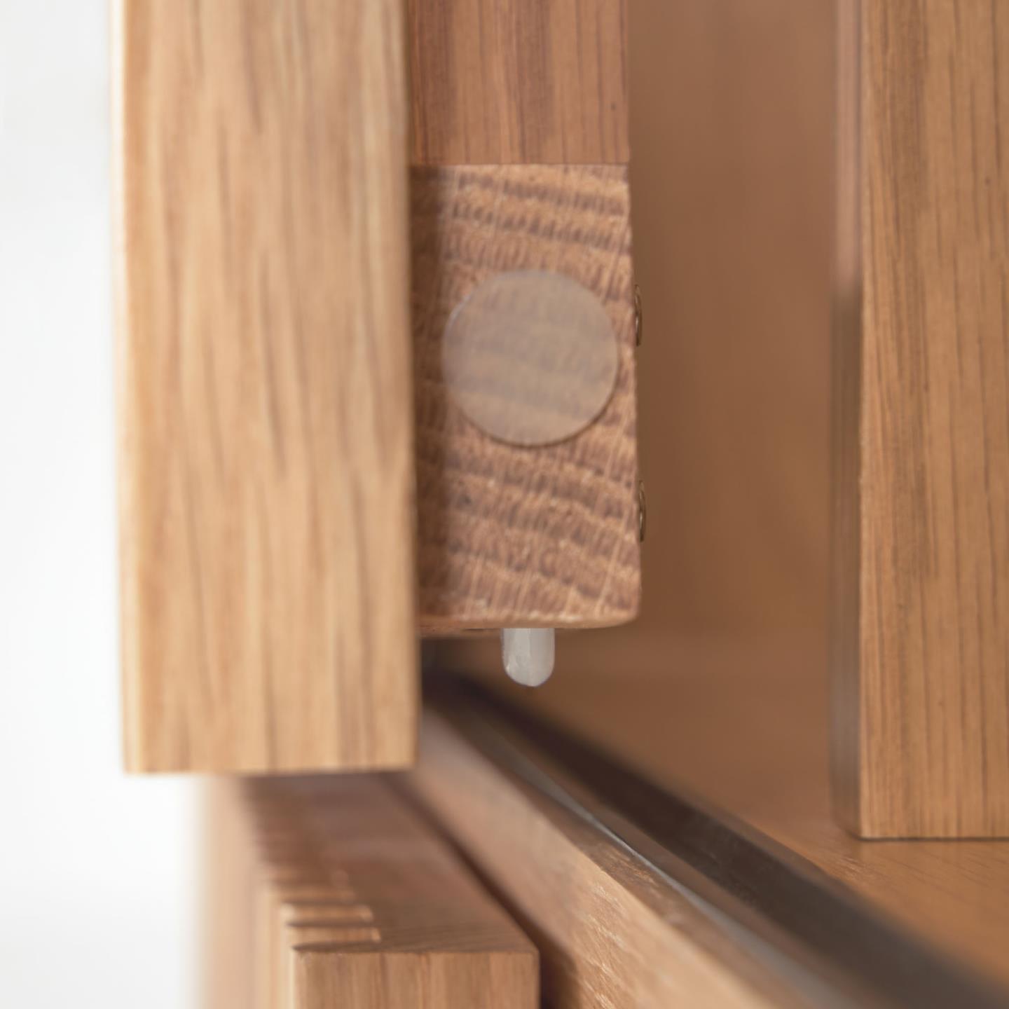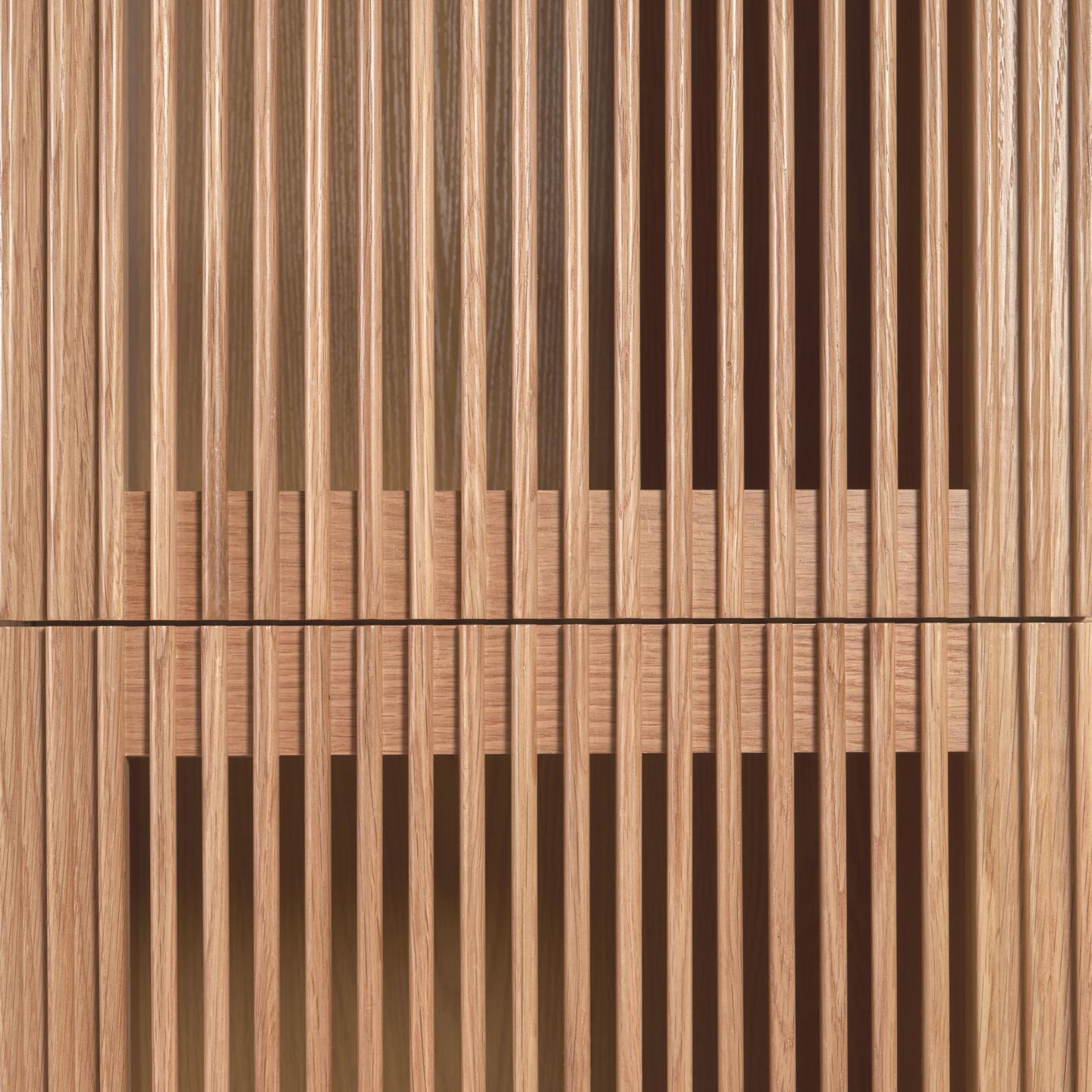 Das Regal Beyla bietet nicht nur praktischen Stauraum, sondern ist auch ein Ausdruck von Liebe zum Detail und ästhetischem Anspruch. Die Lamellentüren aus massivem Eichenholz erzeugen subtile Lichtspiele und verleihen dem Regal einen unverwechselbaren Charakter. Wir achten auf jedes Detail, um ein großartiges Design zu erreichen, das die Aufmerksamkeit auf sich zieht und den neuesten Designtrends entspricht. Die Schiebetüren aus massivem Eichenholz harmonieren perfekt mit dem Korpus in Eichenfurnier und schaffen ein stimmiges Gesamtbild. Das Regal Beyla begeistert nicht nur durch sein Aussehen, sondern bietet auch Funktionalität.