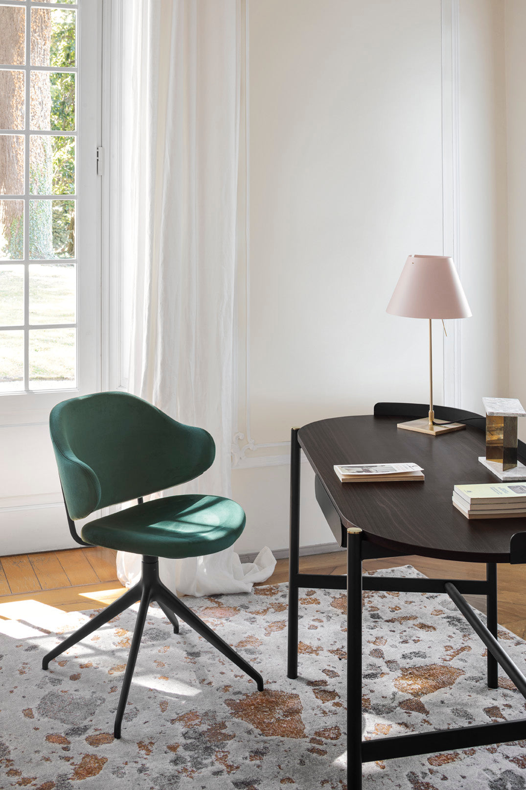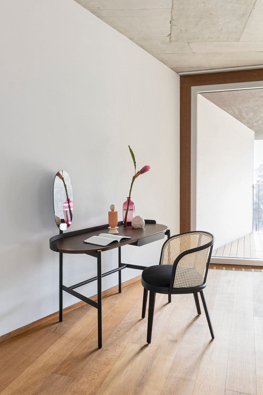 Schreibtisch Madame ist ein vielseitiger Vorschlag, der mit Blick auf unterschiedliche Nutzungsanforderungen entworfen wurde. Der Schreibtisch vereint die Eleganz geometrischer Linien, während die Perfektion der ovalen Form das leitende Motiv darstellt, was sowohl in der Form der Tischplatte als auch der Schublade sichtbar ist. Dies ist die ideale Wahl, um einen stilvollen Arbeitsplatz zu schaffen, der Funktionalität mit raffiniertem Design verbindet.