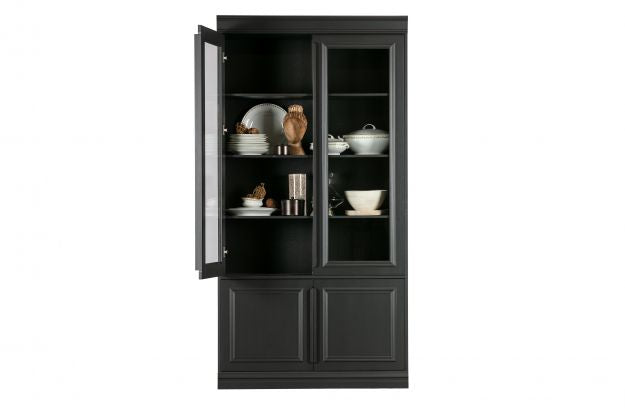 Website Organizer ist ein klassisches Möbelstück in einer modernen Ausgabe. Tiefe, schwarze Farben und matte schwarze Griffe verleihen ihm einen eleganten und zeitlosen Charakter. Die glasierte Obertür macht es zu einem idealen Angebot, Dekorationen oder Keramik zu zeigen.