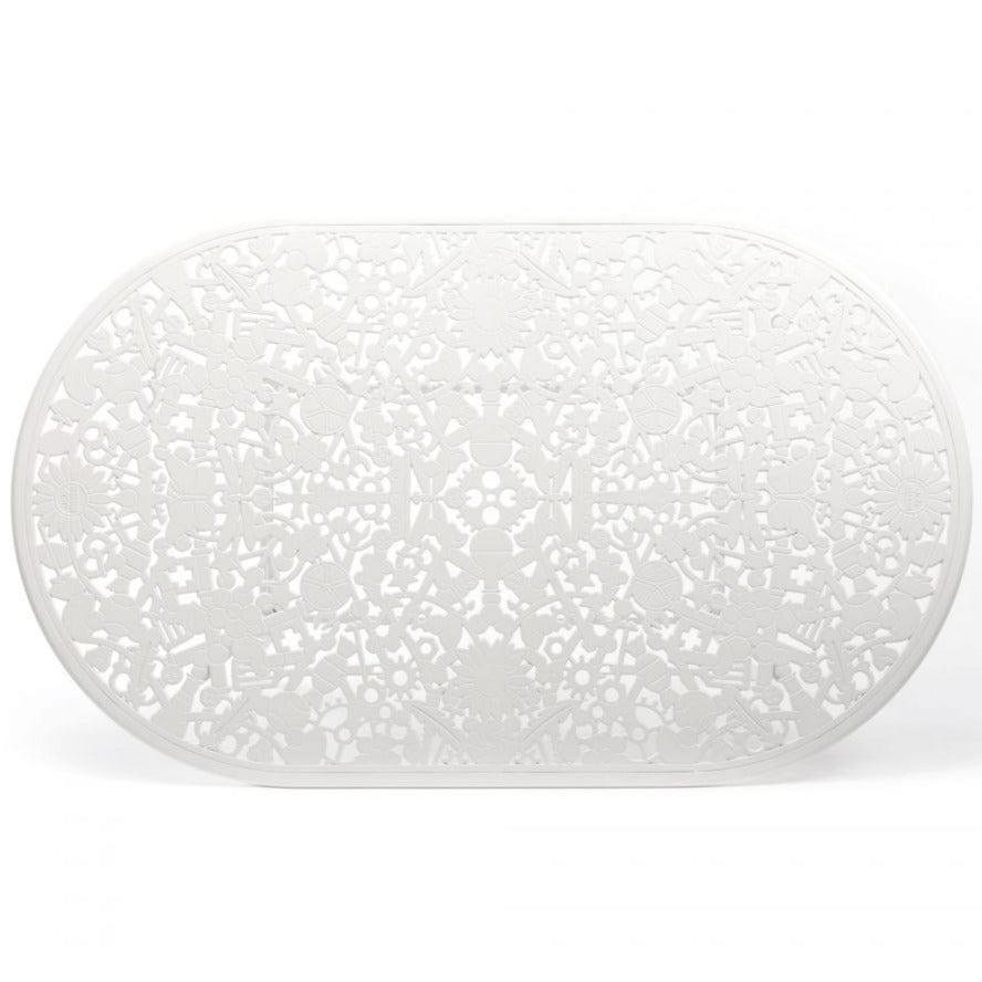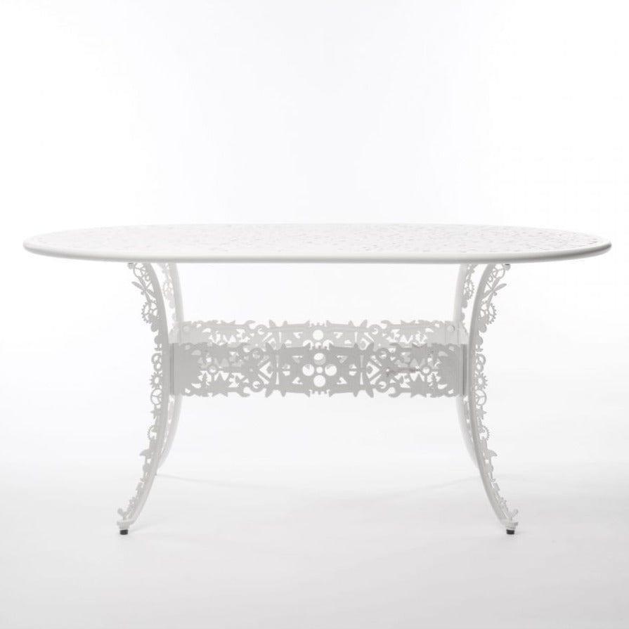 Außergewöhnlich Tisch Garten Im viktorianischen Stil in einer neuen Avant -Gart -Edition ist die Arbeit der italienischen Marke Seletti. Der Rücken und sitzen verstecken zahlreiche ungewöhnliche Muster wie Zahnräder oder Blumen, die dem Ganzen einen einzigartigen Charakter verleihen.