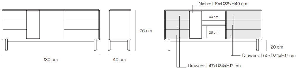 Kommode Corvo wird dank der geräumigen Regale und Schubladen den Raum im Wohnzimmer oder Esszimmer ordnen. Das interessante Design von Eric Cambres und Carlos Garcia umfasst auch ein vertikales Regal ohne Front, das es ermöglicht, Gegenstände als zusätzliche Dekoration zu präsentieren.