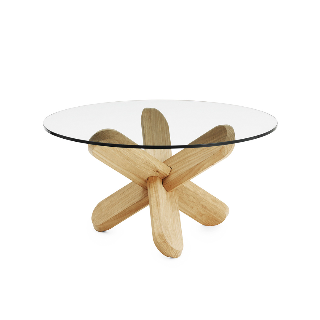 Couchtisch Ding ist eine Kombination aus minimalistischem Design und Funktionalität, inspiriert von traditionellen dreidimensionalen Rätseln. Drei Eichenbeine werden ohne Verwendung von Werkzeugen und Schrauben montiert, wodurch eine skulpturale Basis für ein Glasoberteil erzeugt wird. Phased Kanten sorgen für Stabilität, und das runde Glas Glas liegt wahrscheinlich auf der Struktur.