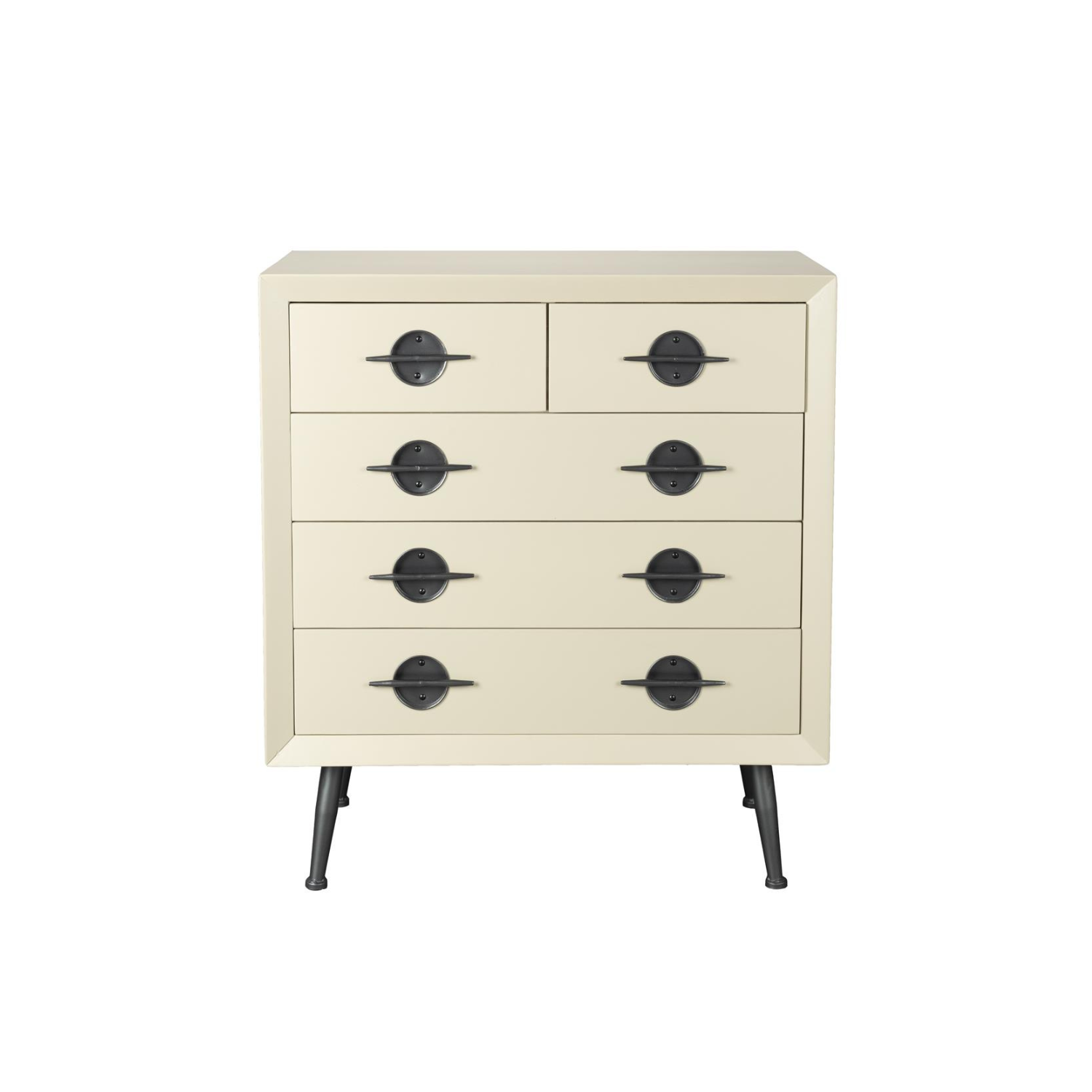 Kommode Edson in einer cremigen Farbe ist die perfekte Wahl für diejenigen, die dem Innenraum einen kleinen modernen Charakter mit einem Hauch von industriellem Stil verleihen möchten. Aus Holz mit warmem, cremigem Finish führt die Truhe der Schubladen ein Gleichgewicht zwischen Gemüt und Geräumigkeit. Eisenbeine und Griffe sind ein ausgeprägter Kontrast, der dem Ganzen einen einzigartigen und stilvollen Look verleihen.