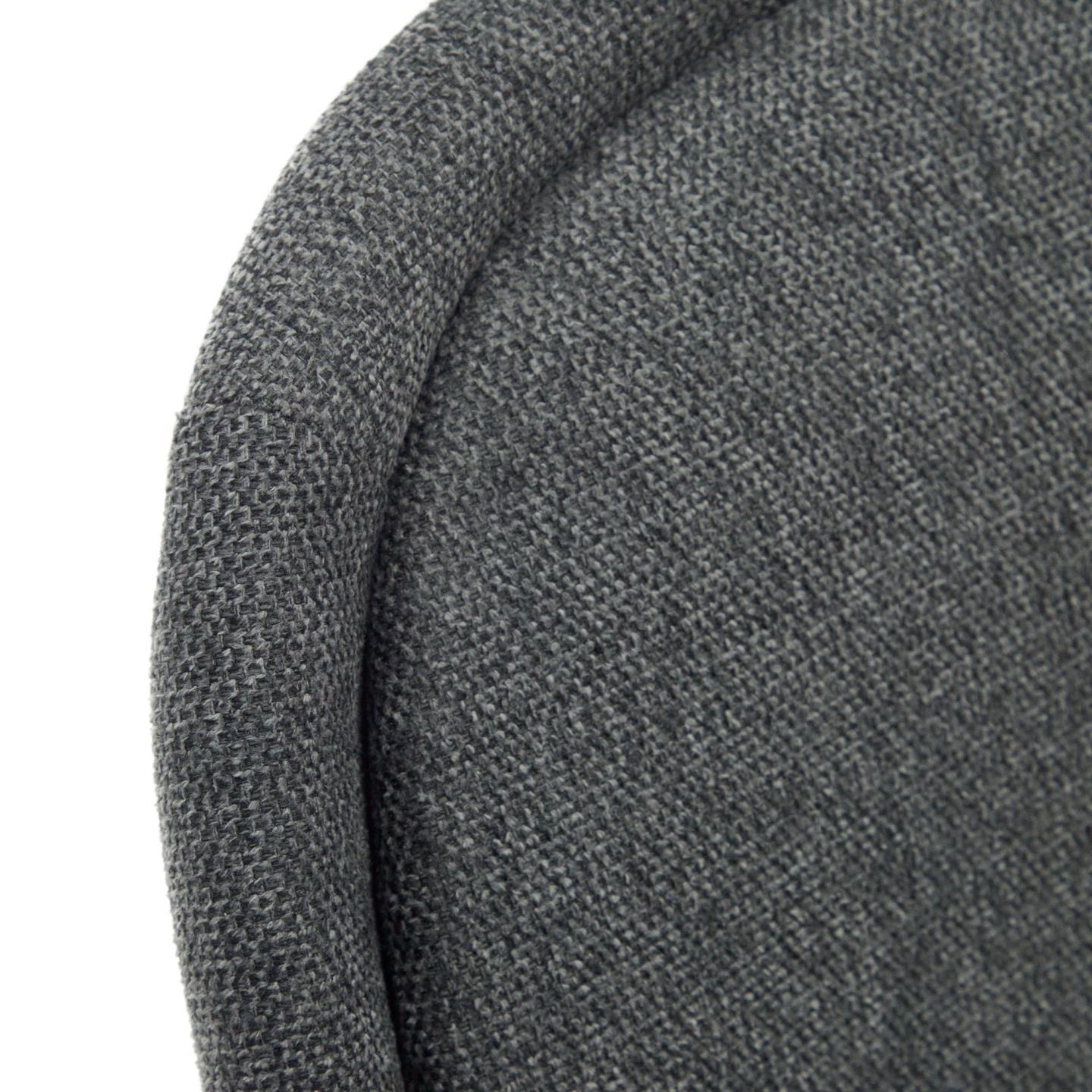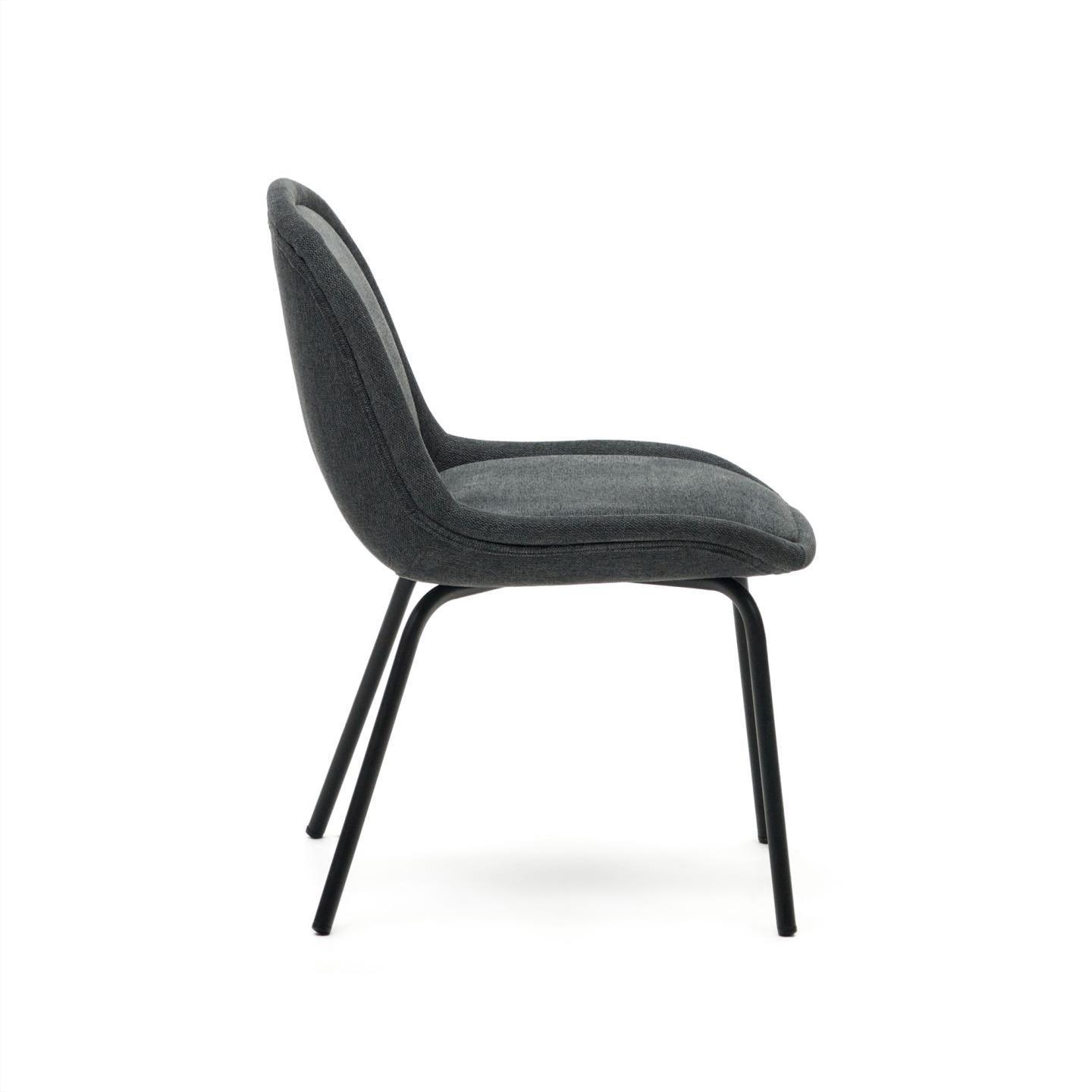 Die Polsterung des dunkelgrauen Stuhls besteht aus pflegeleichtem Chenille, was das Möbelstück praktisch und einfach zu reinigen macht. Die Metallkonstruktion mit mattem, schwarzem Lackfinish verleiht dem Stuhl ein modernes Aussehen und Langlebigkeit.