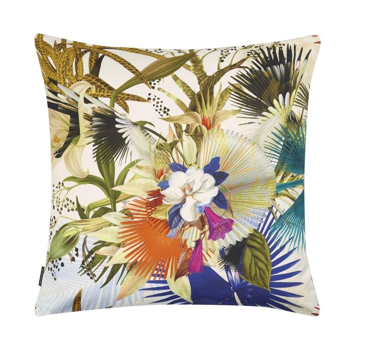 Die außergewöhnliche Dekokissen von Maison Christian Lacroix begeistert mit einem Motiv aus paradiesischen Pflanzen, umgeben von einer Fülle an Farben und Nuancen. Das Kissen besteht aus luxuriöser, baumwollener Satin. Die Rückseite des Kissens ziert ein Muster in hellen Farbtönen, das dem Raum einen Hauch von Luxus verleiht.