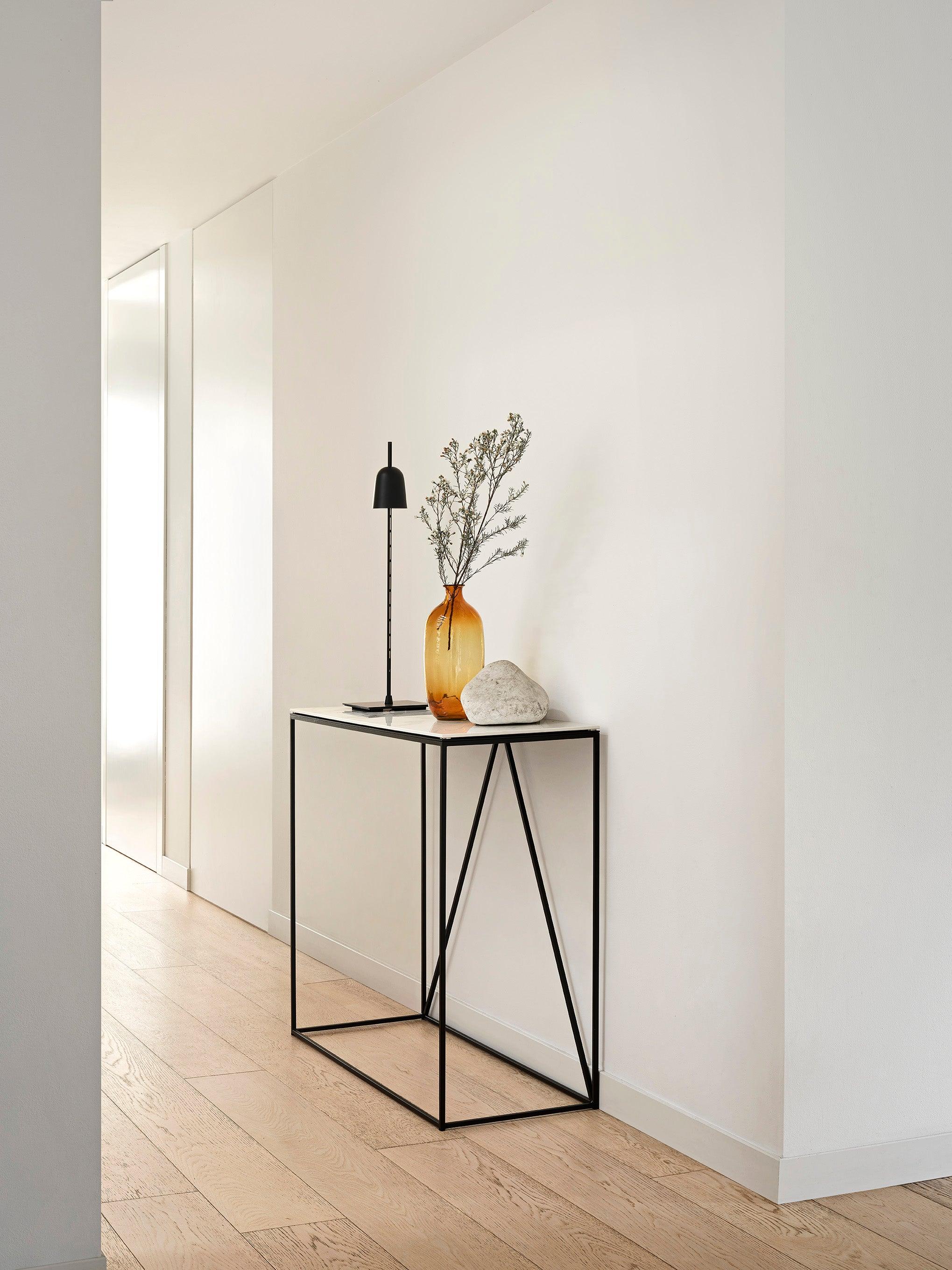 Sammlung Tische Dünne strahlt eine geräumige Atmosphäre aus und hat eine minimalistische Geometrie. Das Konsole Es kombiniert reibungslose Elemente im industriellen Stil, die durch eine harmonische Kombination aus Metall und Blech gekennzeichnet sind. Das moderne Design sorgt für die Kompatibilität mit jedem Dekor und bietet sogar die Möglichkeit eines exquisiten Marmorkeramik -Tops.