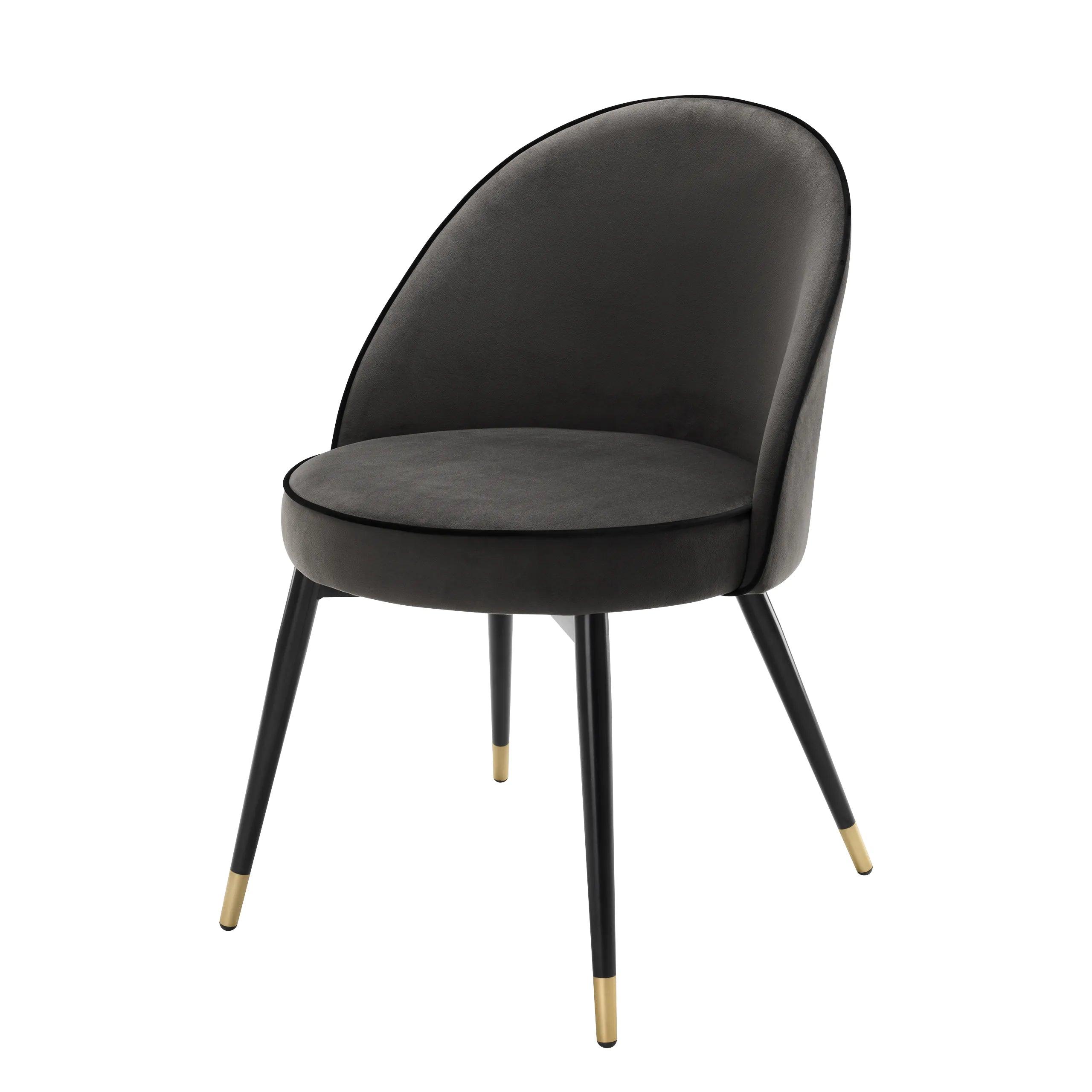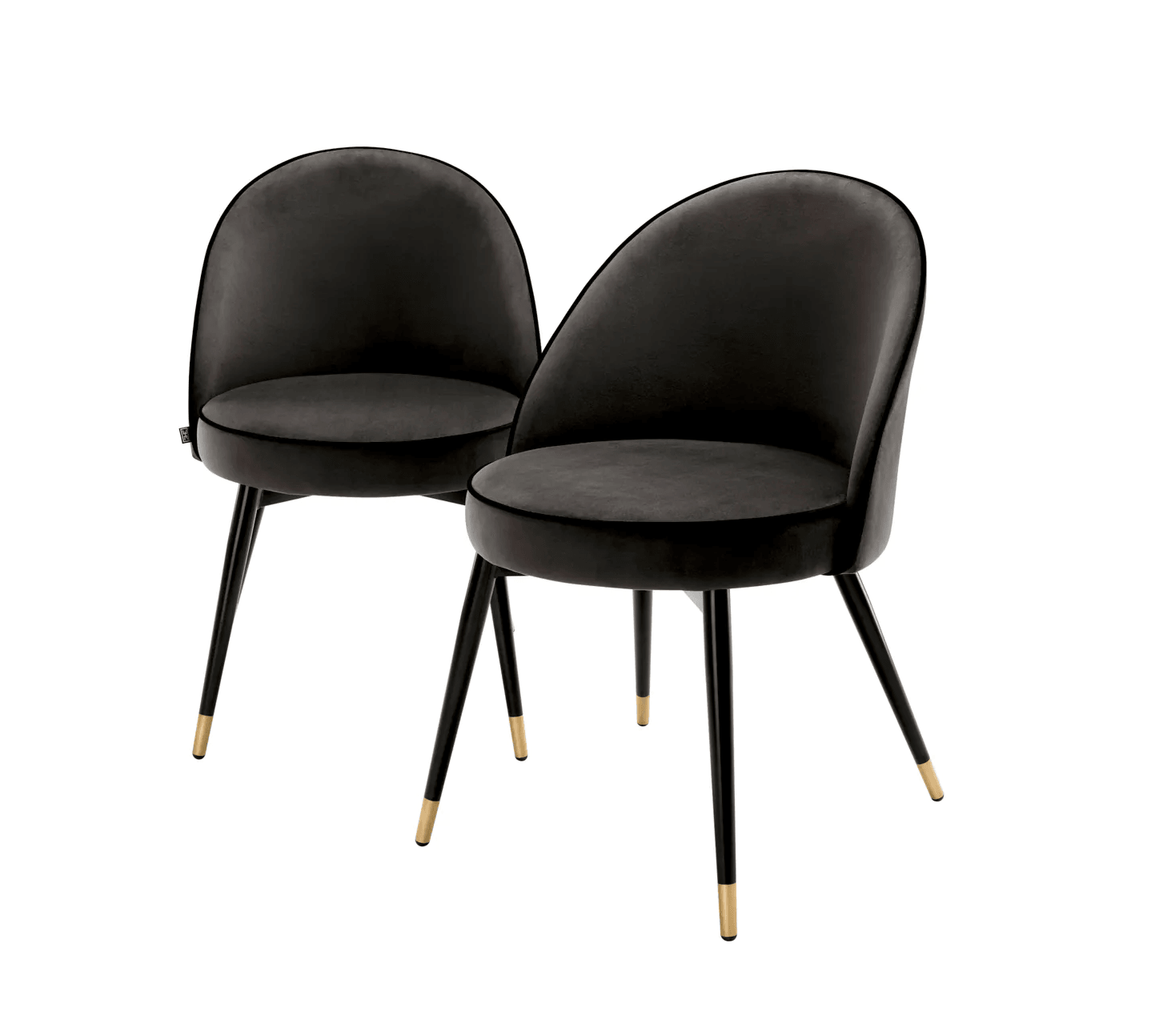 Der Sitz und die Unterstützung von Savona Velvet -Polster sind sanft mit einem schwarzen Trimmen beendet und verleihen den Stühlen einen eleganten Charakter. Die verengten schwarzen Beine sind eine Hommage an die klassischen Formen dieses Stils, während Messingkappen ein kleiner, aber ausdrucksstarker Akzent sind, der ihr luxuriöses Aussehen erhöht.