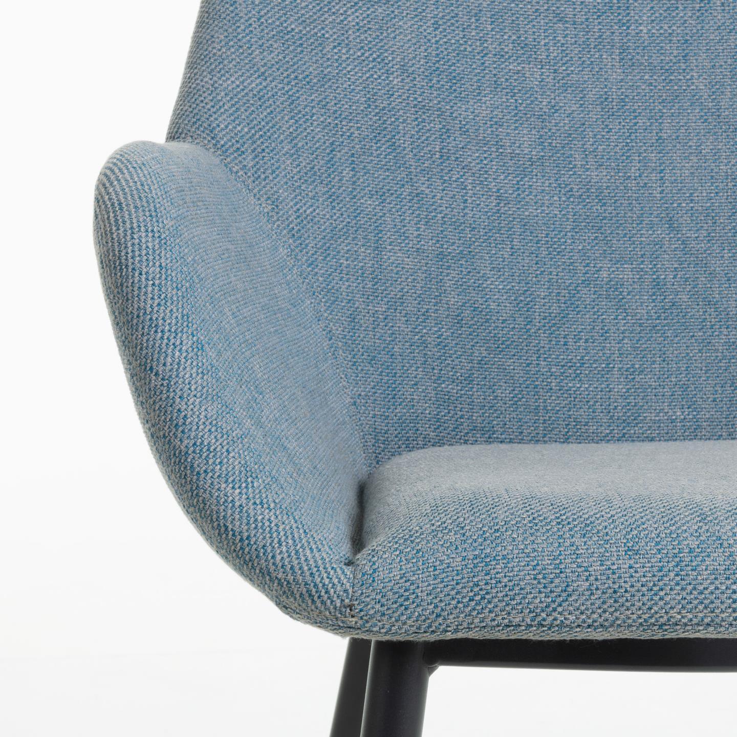 Ein Stuhl in einem hellblauen Pferdstoff mit einer schwarzen Basis