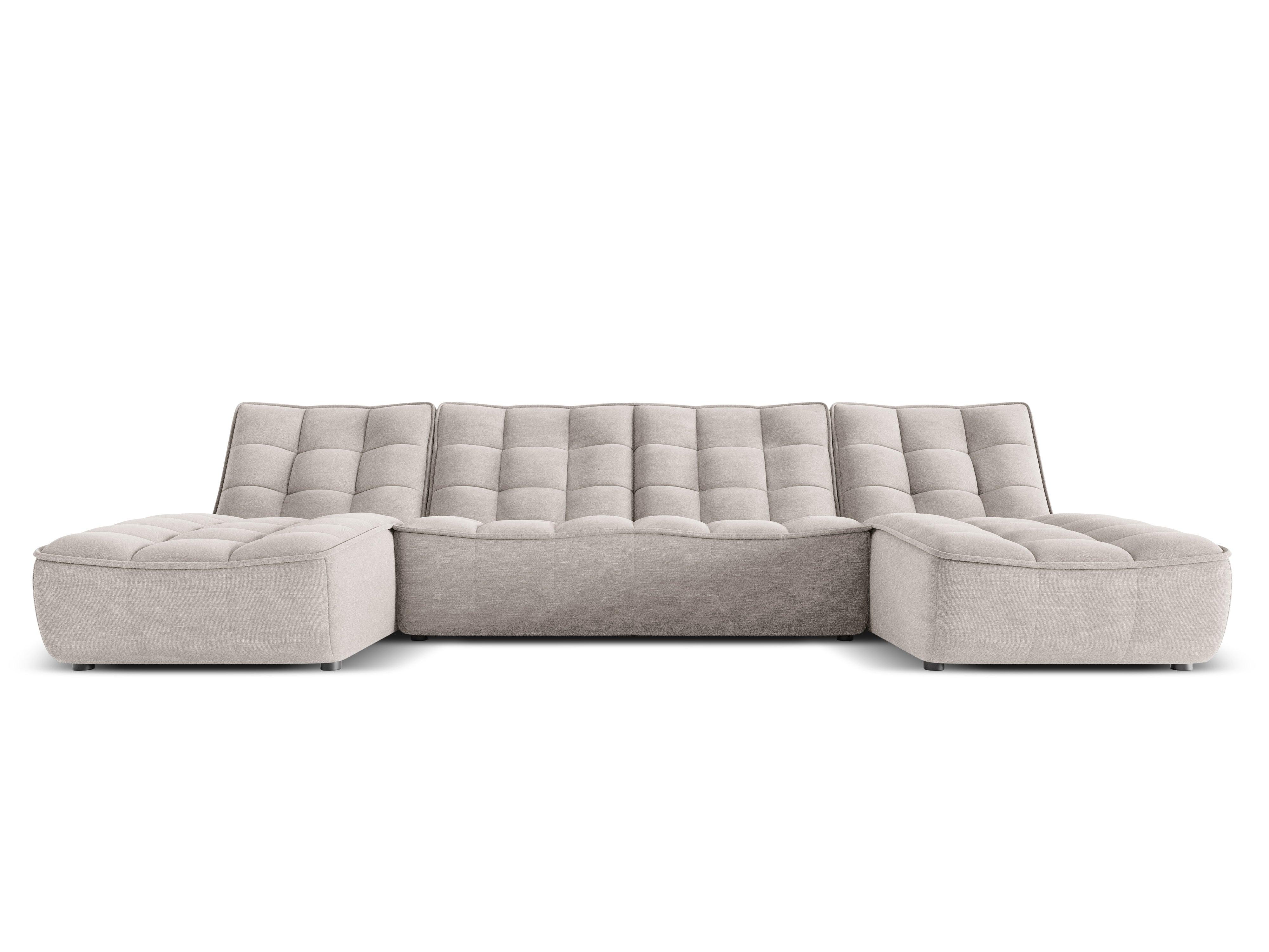 Der panoramische Ecksofa Moni definiert Funktionalität und Komfort in Kombination mit modernem Design. Stilvolles Steppdesign und die originelle Form eignen sich sowohl für ein elegantes Wohnzimmer als auch für ein modernes Büro. Die Linie der Sitzfläche und der Rückenlehne ist gebogen und verfügt über eine sanft geformte Vertiefung, die außergewöhnlichen Komfort bietet.