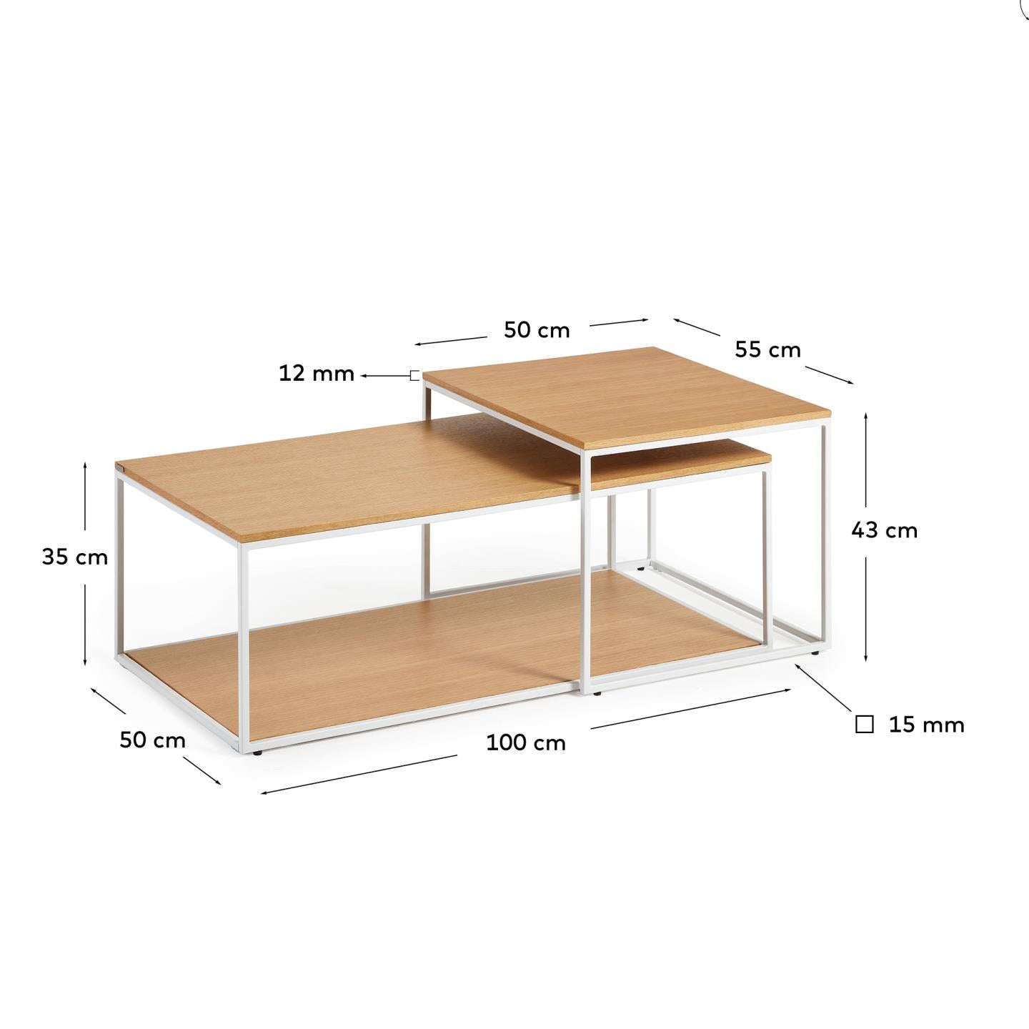 Eichenfurnier verleiht jedem Tisch einen warmen Charakter und betont die natürliche Schönheit des Holzes. Der Metallrahmen in elegantem Weiß schafft einen Kontrast und verleiht dem Set Modernität und industriellen Charme. Die Kollektion Yoana ist nicht nur ästhetisch, sondern auch praktisch in einem – diese Tische sind unverzichtbare Begleiter im Alltag.