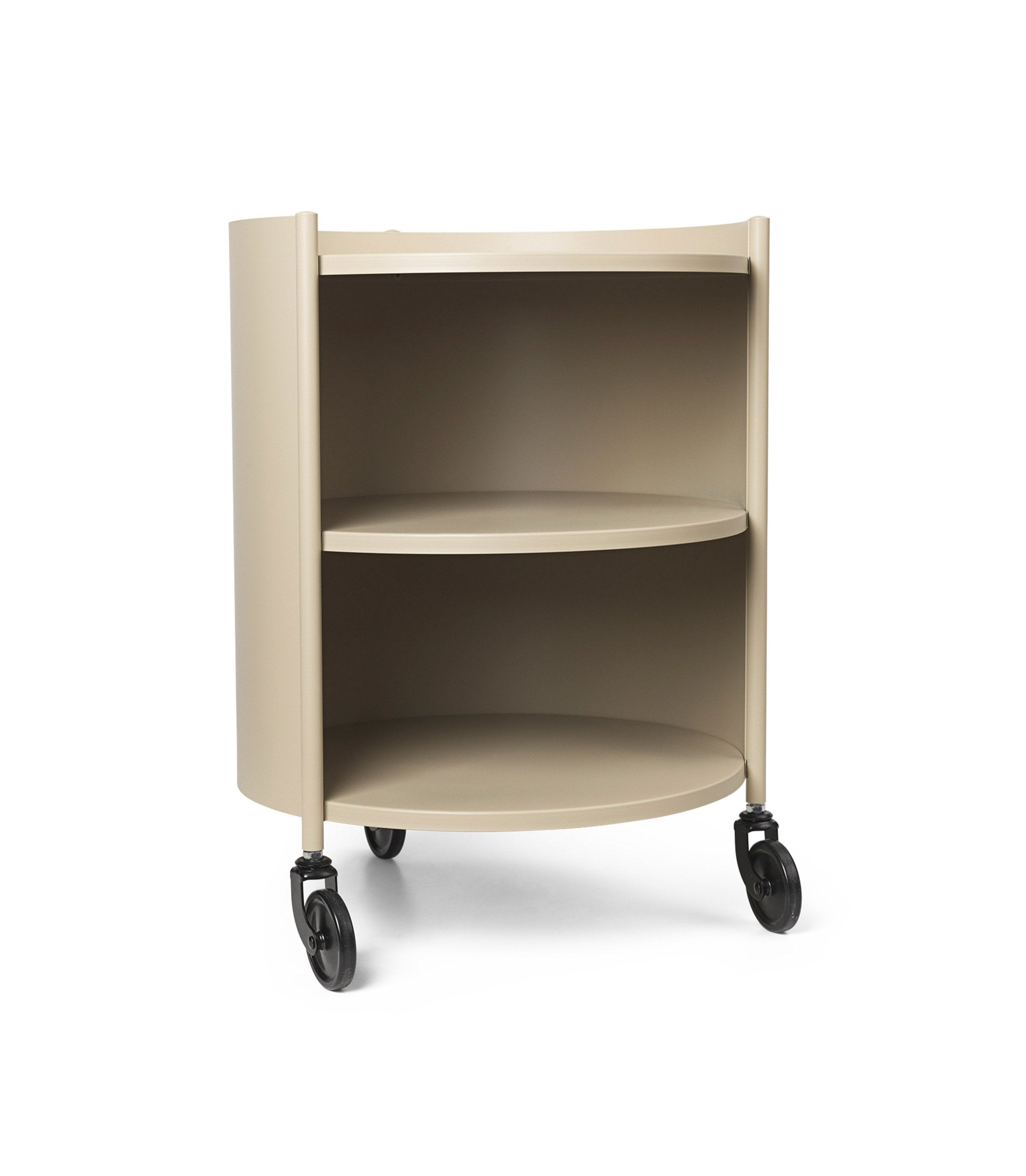 Kabinett Eve ist ein modernes Möbelstück mit einer zylindrischen Form und drei großen Rädern, die aus haltbarer Stahl bestehen, die mit einer Pulverbeschichtung bedeckt sind. Es hat drei Regale, von denen zwei teilweise verborgen sind, und das Obermaterial ist ideal für eine Tischlampe, was es praktisch macht Nachttisch.