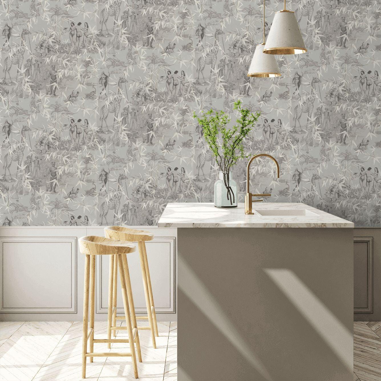 Exotisme Argent ist nicht nur ein Dekorationselement, sondern auch eine Möglichkeit, in Ihrem Zuhause eine Atmosphäre von Luxus und Originalität zu schaffen. Diese Designer-Tapete eignet sich hervorragend für das Wohnzimmer, das Schlafzimmer oder sogar für ein elegantes Büro und verleiht dem Raum einen modernen und raffinierten Charakter.