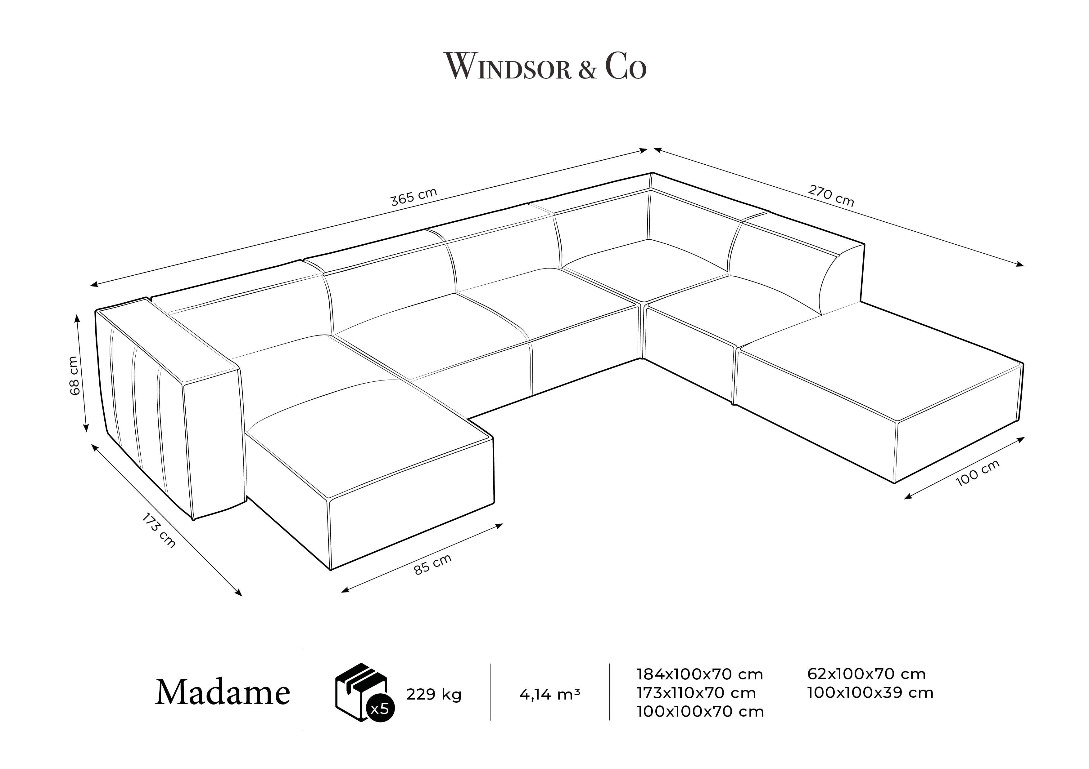 Ecksofa für sechs Personen Madame mit ihrem markanten Charakter und eleganten Finish ist die perfekte Wahl für ein modernes Wohnzimmer. Die tiefe Sitzfläche ist sowohl ideal für gesellige Zusammenkünfte als auch für entspannende Momente nach einem langen Tag. Sie ermöglicht ein bequemes Entspannen in lockeren Positionen. Mit ihrer niedrig gehaltenen Silhouette, breiten Armlehnen und Rückenlehnen schafft sie eine gemütliche Form.