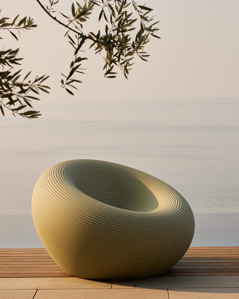 Der Sessel Nami entsteht durch die Drehung von Teilen um eine diagonale Achse, was ihm eine perfekt runde Form verleiht. Die Oberfläche des Sessels wird von geformten Elementen begleitet, die sich von der Mitte zu den Rändern in einer Reihe konzentrischer Ringe entwickeln. In der Mitte des Sessels befindet sich eine Rinne, die den Wasserablauf ermöglicht. Nami ist in sechs Farben erhältlich, drei davon sind Uni-Farben, die anderen drei sind das Ergebnis von Recyclingmaterialien, die zwei bis drei verschiedene Farbtöne kombinieren.