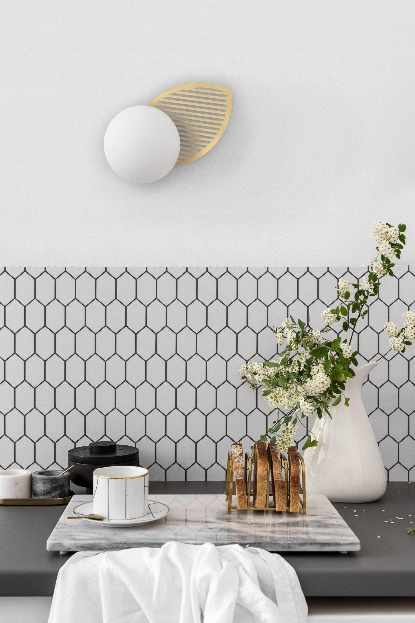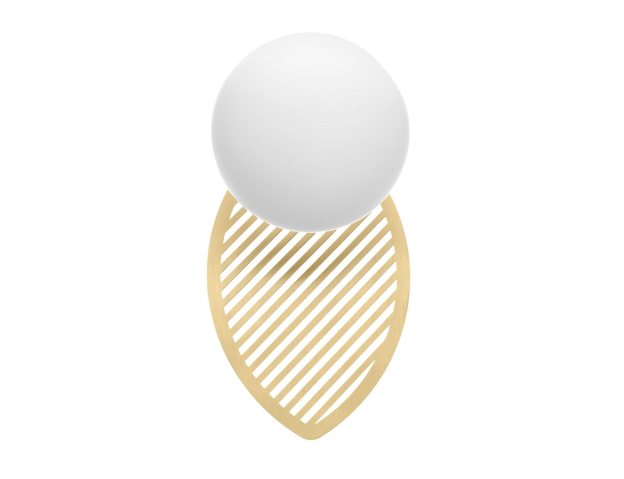 Modern Wandleuchte Fyllo nimmt in seiner Form Bezug auf botanische Motive. Das charakteristische Metallelement, das sich direkt bei der Glühbirne befindet, erinnert in seiner Form an ein Blatt. Die klassische, goldene Farbe verleiht der gesamten Konstruktion Eleganz und modernen Design.