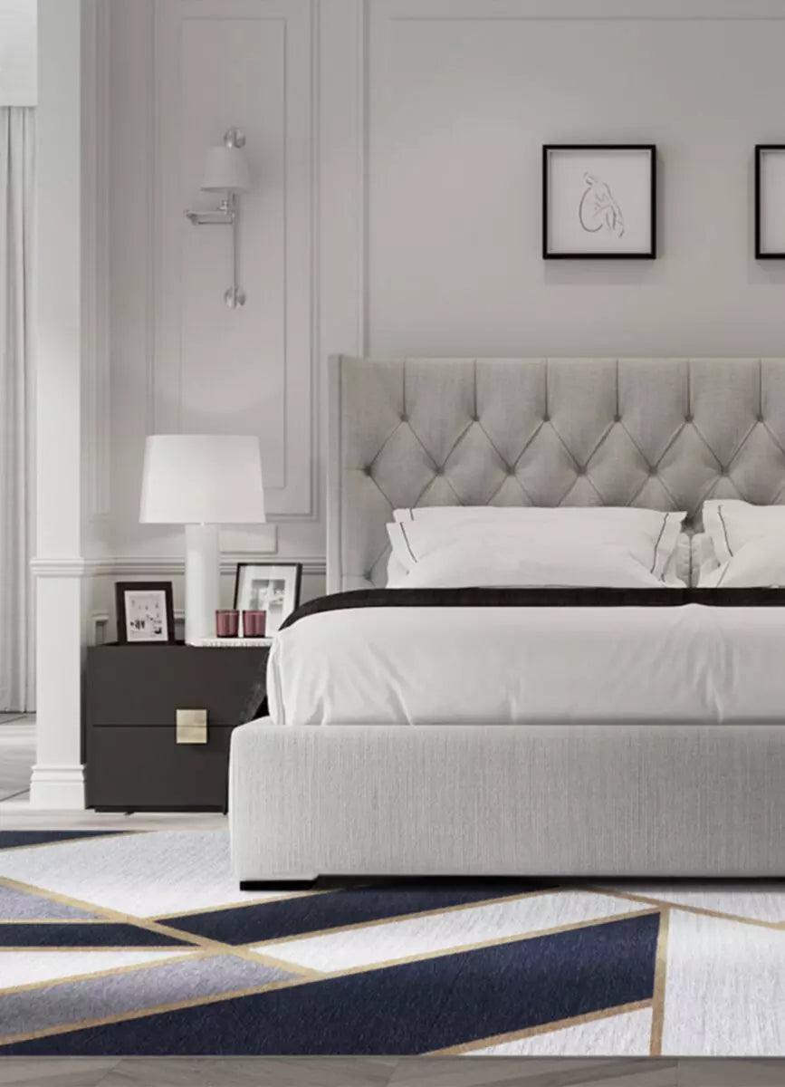 Gatsby Teppich Es ist eine Kombination aus Vintage -Stil mit modernem Design. Es besteht aus einer Mischung aus natürlicher Seide und Wolle, die ihm große Haltbarkeit und Adel verleiht. Dunkelblauer Teppich Es bezieht sich auf das Design der 1920er Jahre, das durch geometrische Motive und einfache Formen gekennzeichnet ist. Auf dem Hintergrund des Sandteppichteppichs gibt es subtile Zeichnungen von Pastellern mit einem warmen Ton, der sich an die zwanzigjährigen Jahre erinnert. Der Name "Gatsby" hat seine Quellen in dem berühmten Roman von F. Scott Fitzgerald "Great Gatsby".