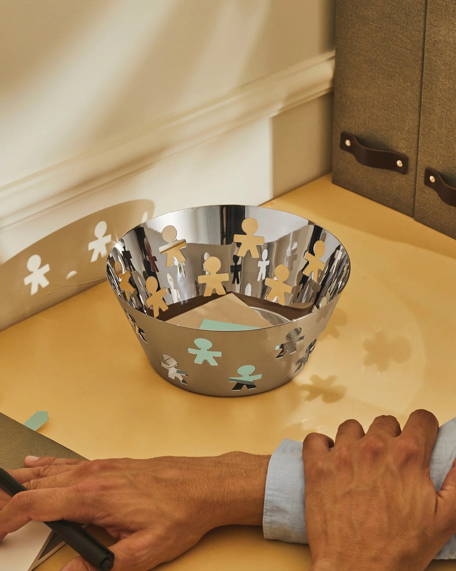 Korb Girotondo, das vom Duo der Designer Stefano Giovannoni und Guido Venturini, bekannt als King-Kong, erstellt wurde, ist ein einzigartiger Gegenstand mit dem Motiv von Cut-Paper-Leuten. Diese lustigen Charaktere sind zu einer Ikone von Mirror, polierten Projekten geworden, die das Konzept der "affektiven Codes" in das Design bringen, das positive Emotionen hervorruft. Zunächst wurde das Motiv der "stehenden Menschen" geschriebene Tabletts und Körbe, aber schnell an Popularität gewonnen und begann auf vielen anderen Gegenständen zu erscheinen, nicht nur in der Küche. Der Girotondo -Korb kombiniert die Funktionalität mit einem einzigartigen Stil und wird sowohl zu einem praktischen als auch zu einem dekorativen Element jedes Innenraums.