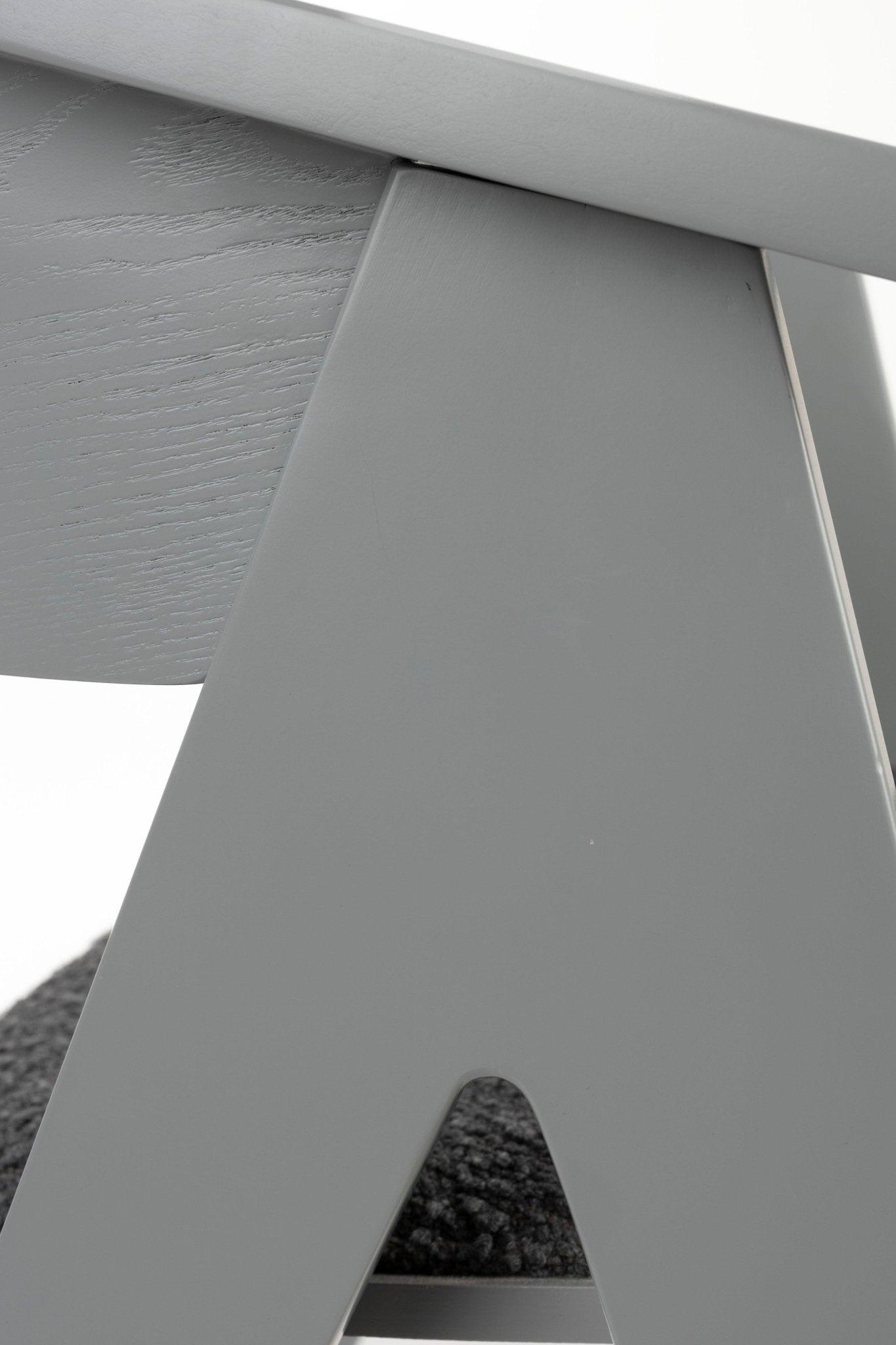 Die Sitzfläche ist mit Boucle-Stoff gepolstert, was eine weiche Oberfläche zum Sitzen bietet.