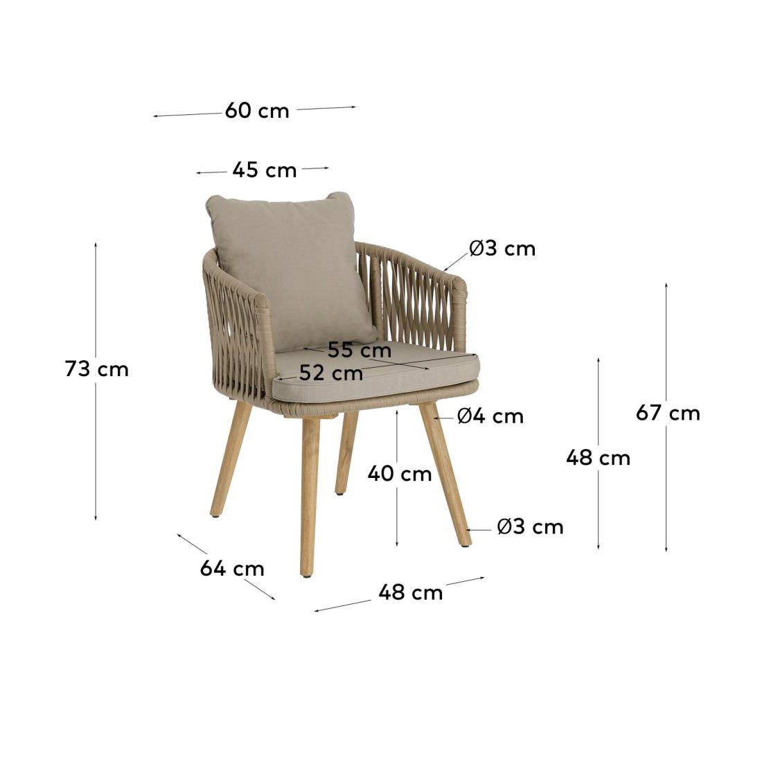 Beige Gartenstuhl Beige Hemilce ist nicht nur ein bequemer Ort zum Ausruhen, sondern auch ein Element, das dem Garten einen einzigartigen Charakter verleiht. Seine Vielseitigkeit macht es sowohl innerhalb als auch außerhalb der Räume perfekt und verleiht Ihrem Wohnraum einen natürlichen und eleganten Akzent.