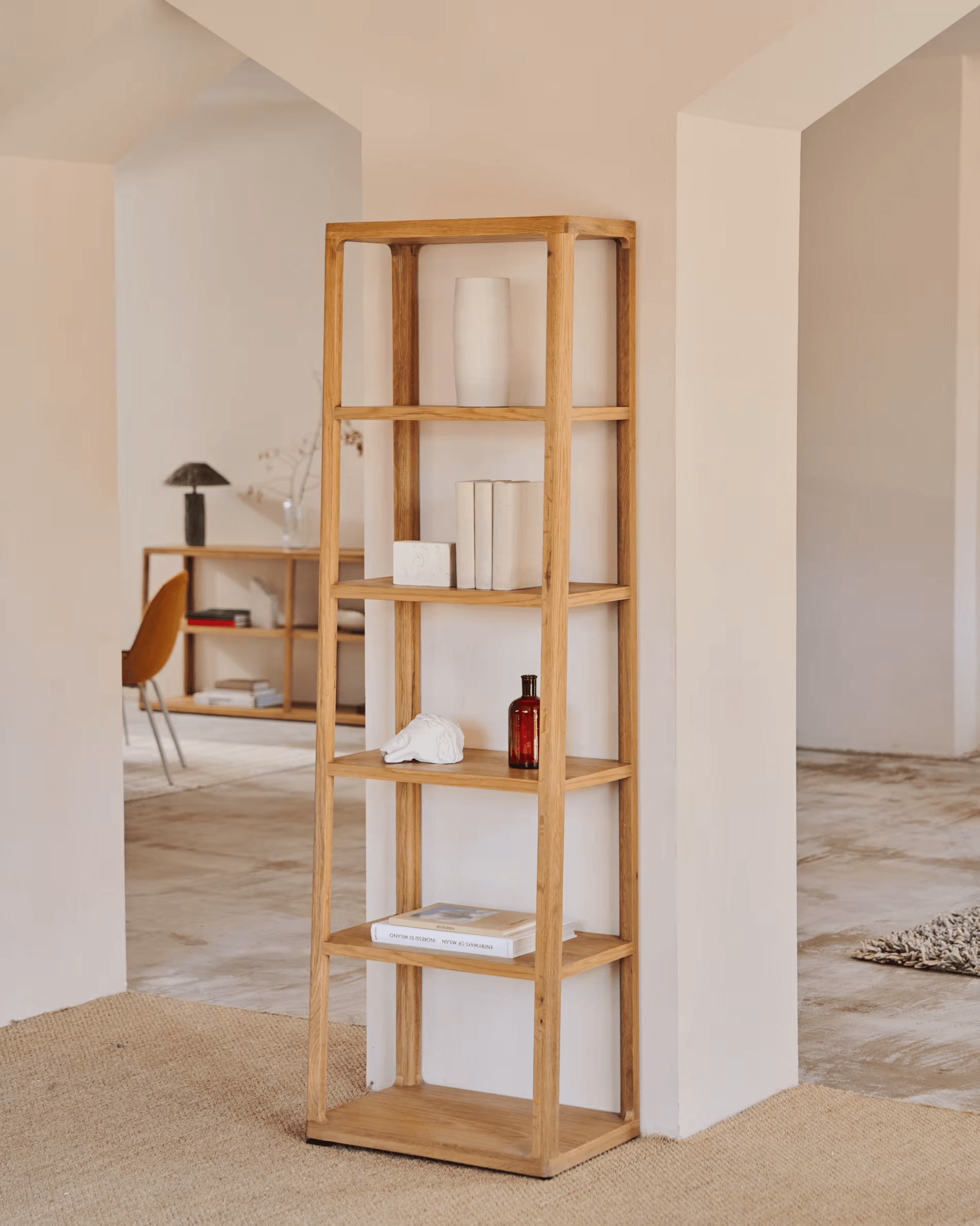 Das hohe Regal von Maymai stellt eine perfekte Harmonie zwischen der natürlichen Essenz des Eichenholzes und dem minimalistischen, langlebigen Design dar. Es sind nicht nur Möbel, sondern ein außergewöhnliches Angebot für diejenigen, die Subtilität, Funktionalität und Ästhetik gleichzeitig in ihr Zuhause bringen möchten.