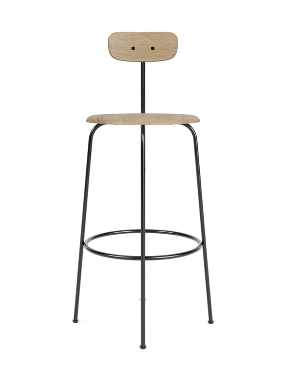 Hocker Afteroom ist eine Hommage an den skandinavischen Minimalismus und funktionales Design. Entworfen mit dem Gedanken an die Einfachheit der Form und den Nutzungskomfort, zeichnet er sich durch klare Linien und eine subtile, leichte Konstruktion aus. Die Sitzfläche und die Rückenlehne aus furniertem Holz bringen natürliche Wärme in den Raum, während das pulverbeschichtete Stahlgestell Stabilität und Langlebigkeit garantiert. Dies ist die ideale Wahl für Kücheninseln, Bars und moderne Gastronomieräume.
