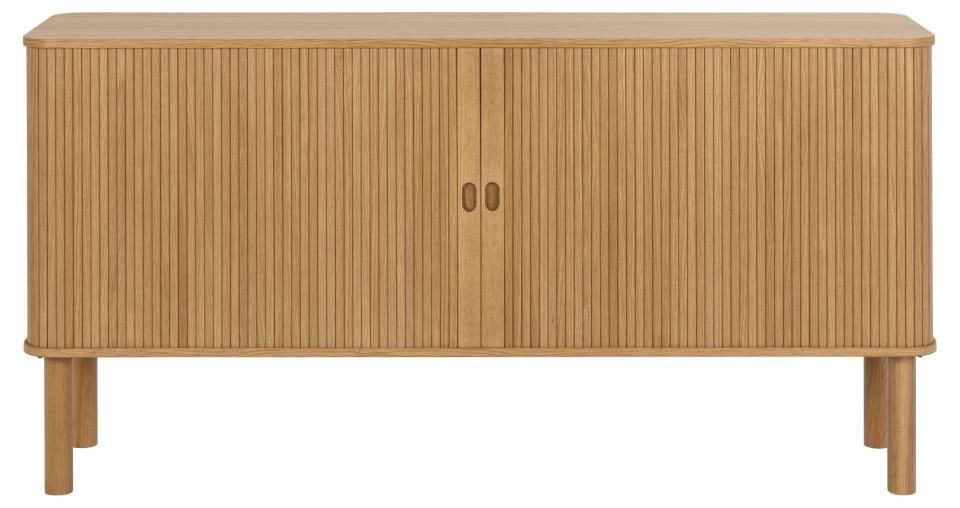 Kommode Langley Es ist ein elegantes Möbelstück, das ideal für moderne Innenräume ist. Sein Design zeichnet sich durch eine rechteckige Form mit dekorativen Lamellenfronten und praktischen Schiebetüren aus. Dank der natürlichen Details der lackierten Eiche bringt Langley jedem Raum Wärme und Stil. Perfekt als funktionales und dekoratives Element im Wohnzimmer, Esszimmer oder Büro und kombiniert Ästhetik mit praktischer Bedeutung.