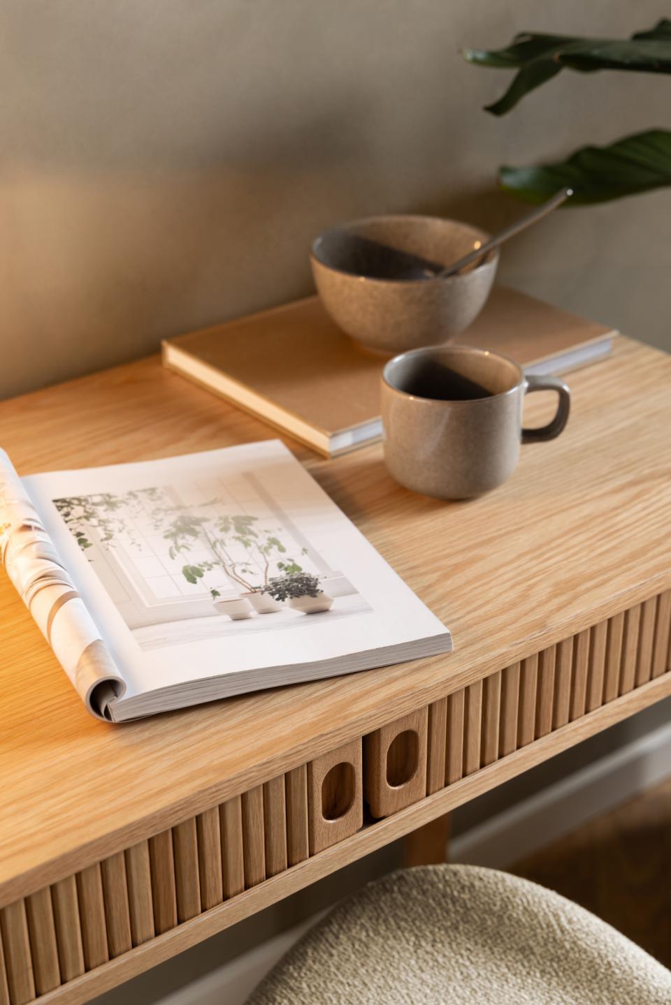 Langley Dies ist ein eleganter Schreibtisch mit einem modernen Design, ideal für jedes stilvolle Büro. Die rechteckige Form mit abgerundeten Hörnern und Lamellenfront verleiht ihr Charakter. Der Schreibtisch ist mit einer Schiebetür ausgestattet, die Funktionalität und Stil verleiht. Natürliche Akzente aus lackierter Eiche betonen ihre Ästhetik und verbinden Eleganz mit der Praktikabilität. Langley geht perfekt in verschiedenen Innenarchitekten und bietet nicht nur einen Arbeitsplatz, sondern auch ein elegantes dekoratives Element.