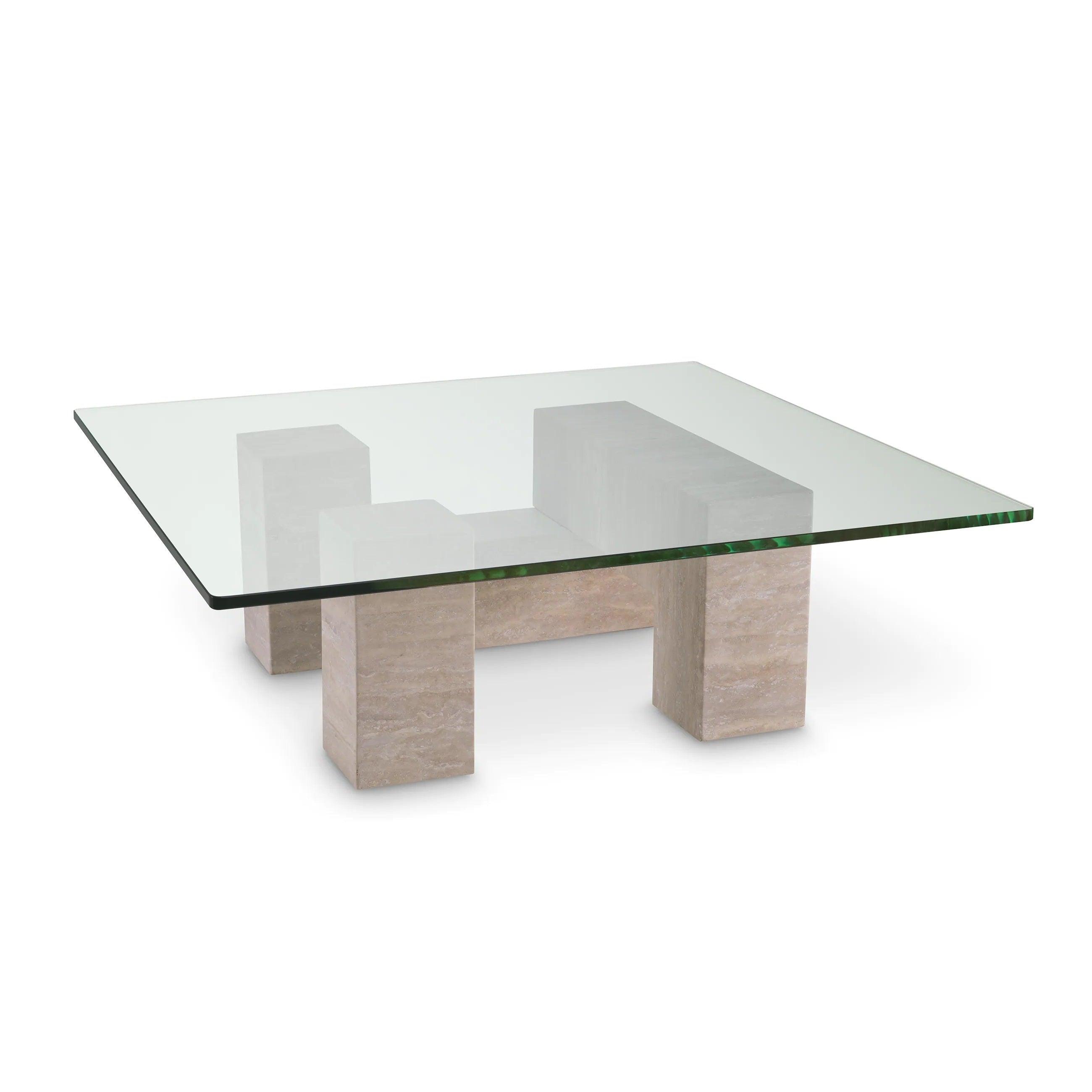 Auf dieser massiven, aber auch einer eleganten Grundlage ruht die Spitze des transparenten Glas. Diese einfache Auswahl des Materials vervollständigt die Zusammensetzung und fügt alle Leichtigkeit und visuelle Geräumigkeit hinzu. Das Glas überwältigt den Innenraum nicht, ermöglicht es Ihnen jedoch, die Schönheit von Travertin vollständig zu erleben.