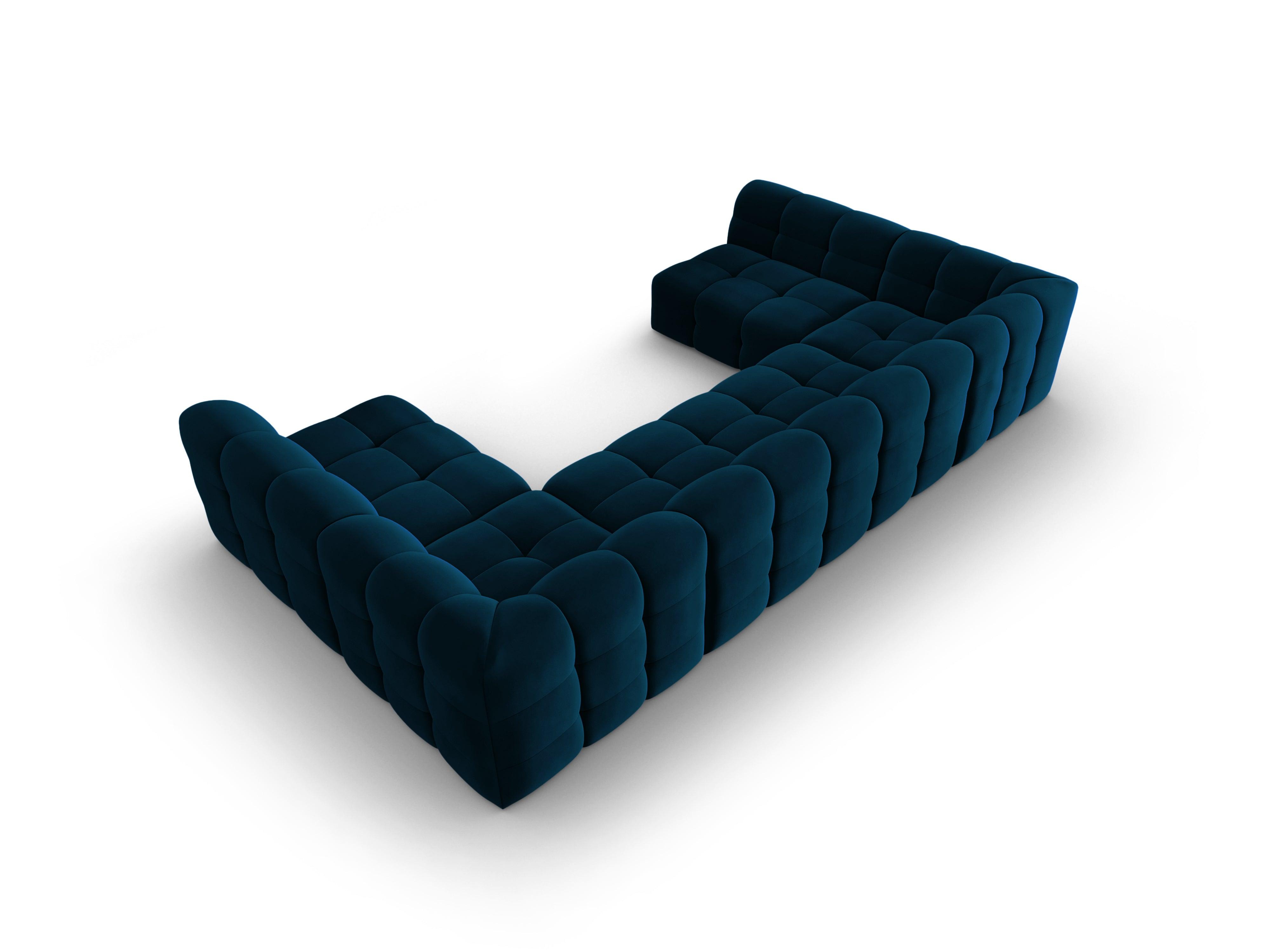 Samet-Ecksofa in U-Form Kendal begeistert mit außergewöhnlichen Nähten und Steppungen, die dem Raum eine außergewöhnliche Eleganz im modernen klassischen Stil verleihen. Die blasenförmige Sitzfläche in Kombination mit der stilvollen Rückenlehne schafft einen komfortablen Ort zum Entspannen nach einem langen Tag.Kendal überrascht mit einer etwas avantgardistischen Form und zieht die Aufmerksamkeit auf sich, egal von welcher Seite wir sie betrachten.