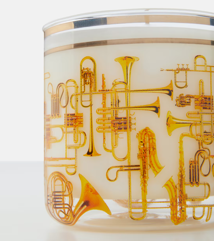 Die Kerze Trumpets ist ein elegantes Accessoire für Musikliebhaber und außergewöhnliches Design. Der Glasbehälter, verziert mit goldenen Grafiken von Trompeten, bringt einen raffinierten, künstlerischen Akzent in jedes Interieur und passt perfekt zu klassischen oder modernen Räumen.