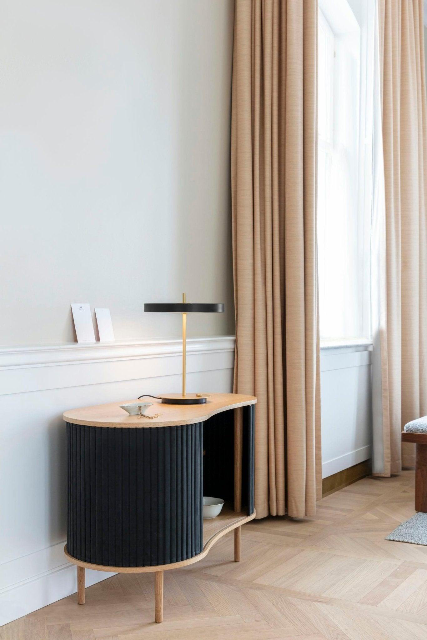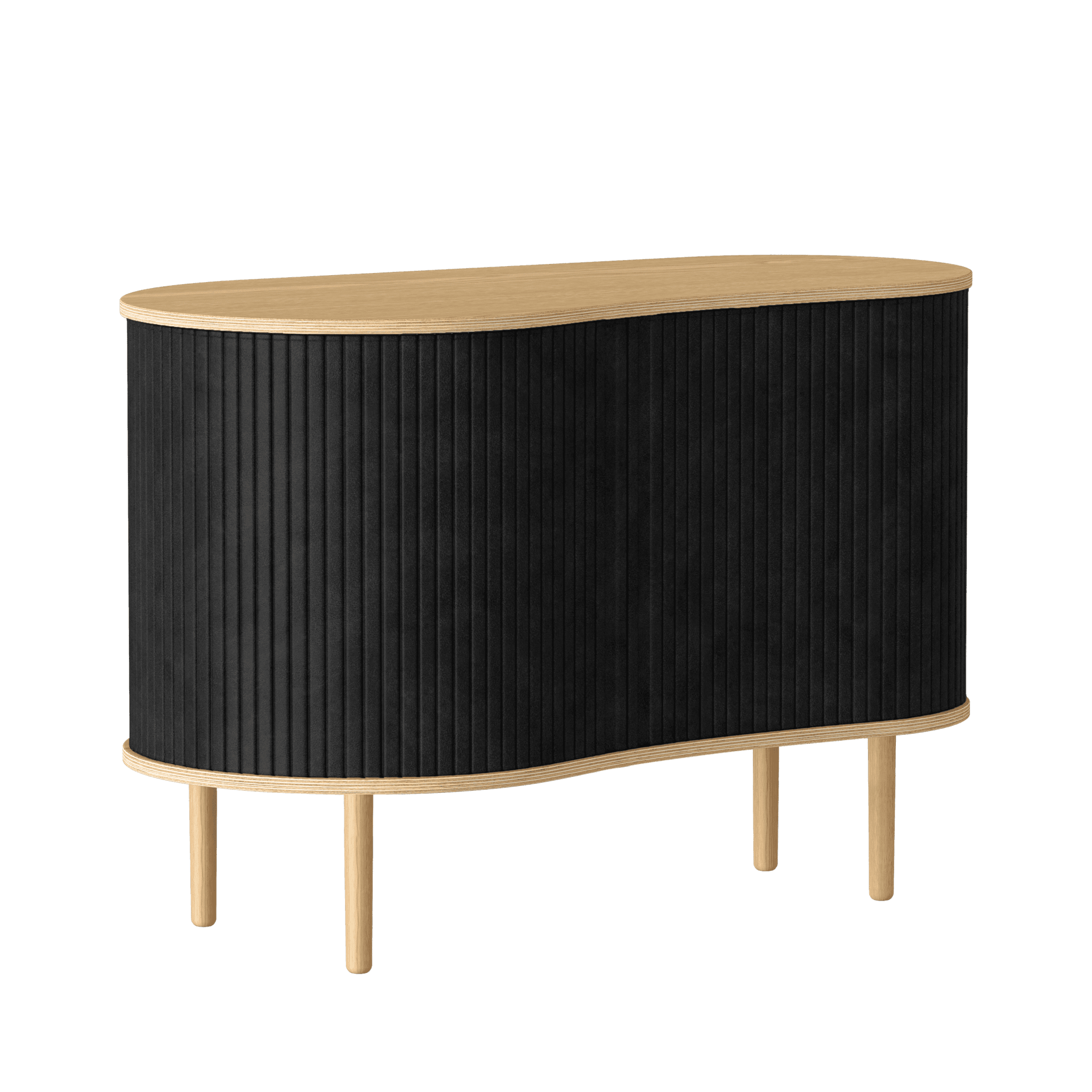 Kommode Es ist in drei ausdrucksstarken Farben erhältlich: Eiche, Dunkle Eiche und schwarze Eiche, mit Jalousien, die in sorgfältig ausgewählten Horizonts -Stofftönen erhältlich sind, die ausschließlich aus Recycling stammen. Wichtig ist, dass die Jalousien austauschbar sind, was bedeutet, dass Sie sie leicht selbst ändern können, wodurch die Möbel ein neues Aussehen verleihen und das Design erfrischen können, ohne völlig neue Möbel kaufen zu müssen. Dank dessen sparen Sie nicht nur globale Ressourcen, sondern erweitern auch die Lebensdauer der Möbel.