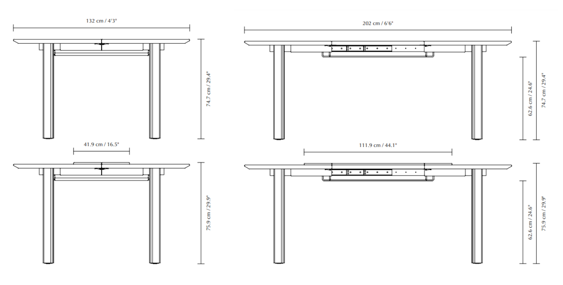 Sein mittlerer Teil ist verstellbar, was ihm Vielseitigkeit verleiht. Er kann sowohl angehoben werden, wenn der Tisch ausgeklappt ist, als auch wenn er zusammengeklappt ist. Dadurch können Dekorationen oder Blumen auf dem Tisch hervorgehoben werden. Darüber hinaus ist die Anpassung der Tischdecke einfach, da der mittlere Teil an den Rest des Tisches angepasst werden kann.