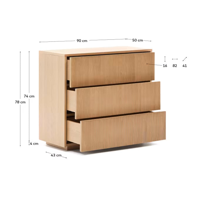 Drei geräumige Schubladen, die auf Berührung geöffnet werden, sind mit versteckten, verstellbaren Führungen ausgestattet und bieten eine bequeme Aufbewahrung. Die Regler an der Unterseite gleichen Unebenheiten des Untergrunds aus und garantieren die Stabilität des Möbelstücks. Die Kommode fügt sich perfekt in die anderen Elemente der Kollektion Helvine ein und schafft einen harmonischen und funktionalen Raum.