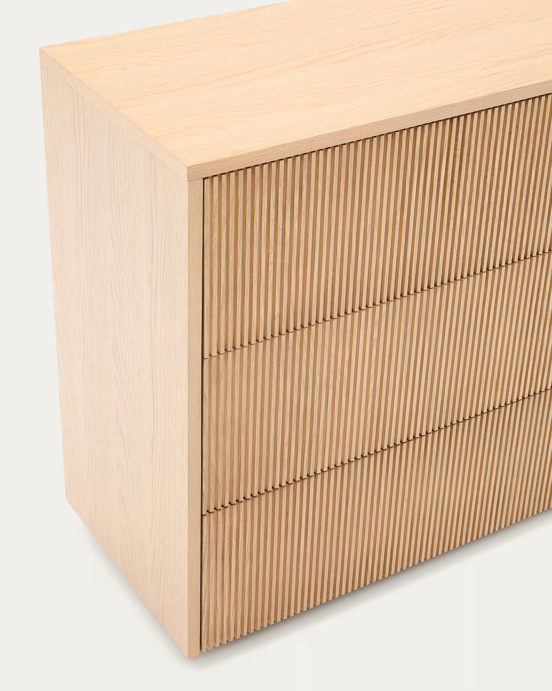 Die Kommode Helvine zeichnet sich durch ein zeitloses Design aus, das von der Einfachheit der Natur inspiriert ist. Das natürliche Eichenfurnier betont den eleganten Charakter des Möbelstücks und bringt einen warmen, gemütlichen Akzent in den Raum. Die minimalistische Form und die sorgfältig ausgearbeiteten Details sorgen dafür, dass die Kommode sowohl mit modernen als auch mit klassischen Arrangements hervorragend harmoniert und dem Raum Leichtigkeit und Harmonie verleiht.