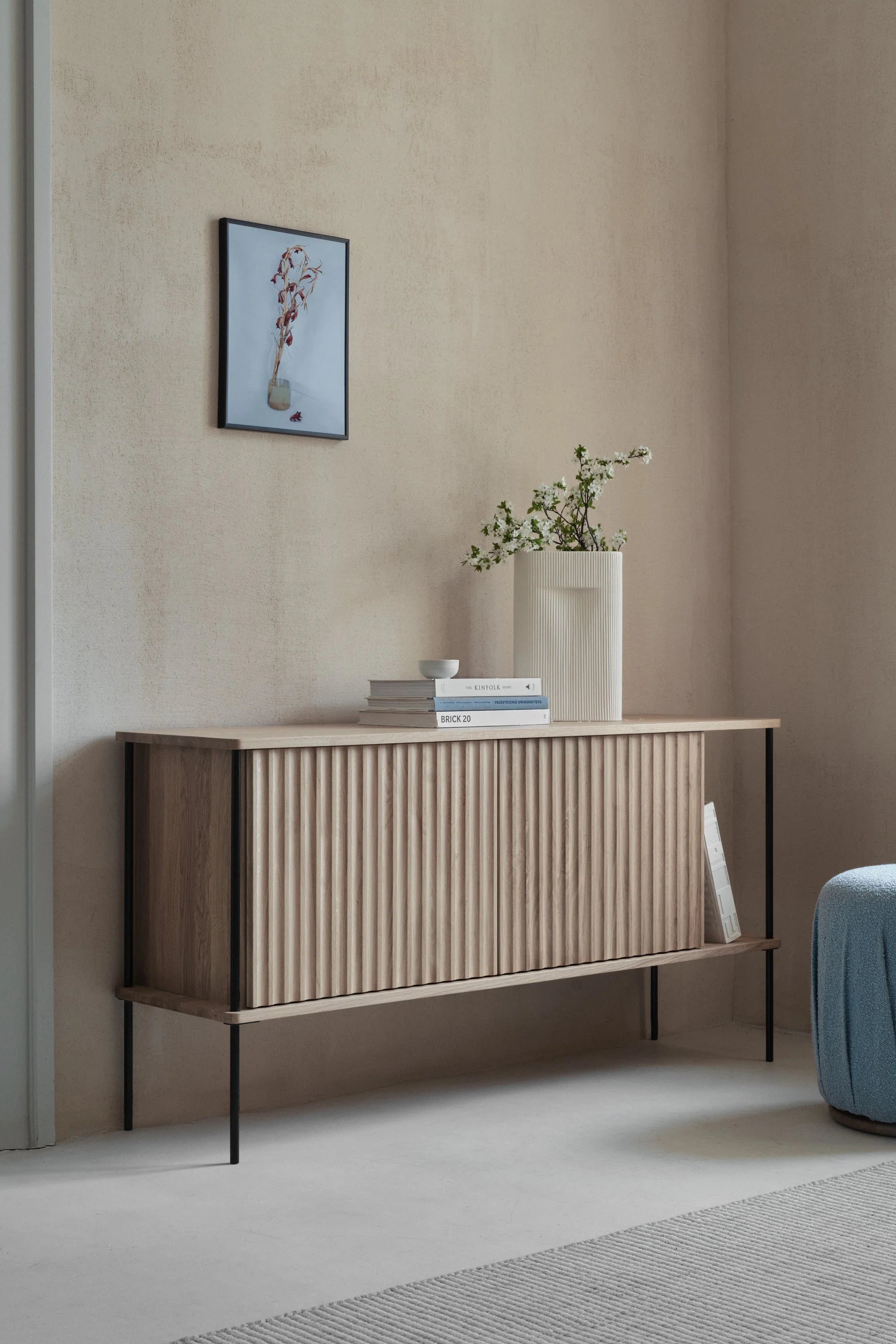Kommode Maya ist ein ausdrucksstück Möbel, dessen wellenförmige, gerippte Front die Aufmerksamkeit wie ein Kunstwerk auf sich zieht. Die Kombination aus massivem Holz und kühlem Stahl verleiht ihr einen modernen, aber warmen Charakter, und das seitliche Regal präsentiert perfekt den Plattenspieler und die Schallplattensammlung, wodurch eine funktionale und stilvolle Entspannungszone entsteht.