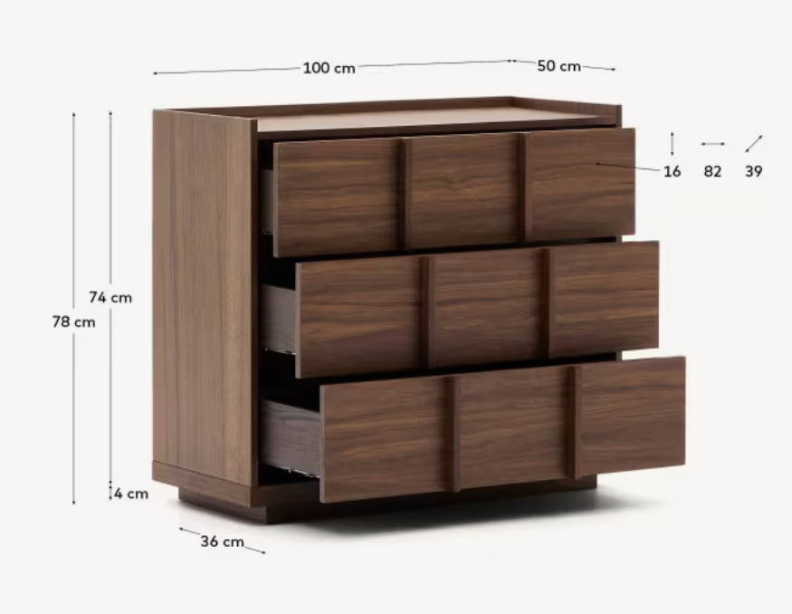 Ausgestattet mit drei geräumigen Schubladen mit verstellbaren, versteckten Führungen und einem geräuschlosen Schließsystem bietet die Kommode Onix hohen Komfort im Alltag. Dank der verstellbaren Beine steht sie auch auf unebenem Untergrund stabil, und das bei ihrer Herstellung verwendete FSC-zertifizierte Holz zeugt von einem verantwortungsvollen Umgang mit der Umwelt.
