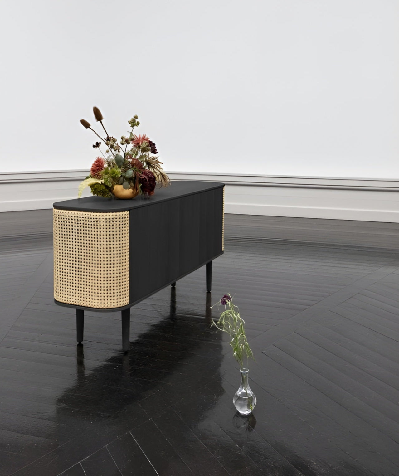 Die Kommode Treasures ist in drei Farben erhältlich: natürlicher Eiche, dunkler Eiche und schwarzer Eiche. Die seitlichen Paneele der Kommode können zusätzlich mit venezianischem Rohr, einem von vier sorgfältig ausgewählten Farben des Stoffes Horizons, der zu 100 % aus recyceltem Material besteht, oder mit braunem Kunstleder dekoriert werden. Die Türen von Treasures sind austauschbar, was bedeutet, dass Sie die Polsterung ganz einfach selbst ändern und das Aussehen des Möbelstücks auffrischen können, wodurch Sie Ressourcen unseres Planeten sparen.