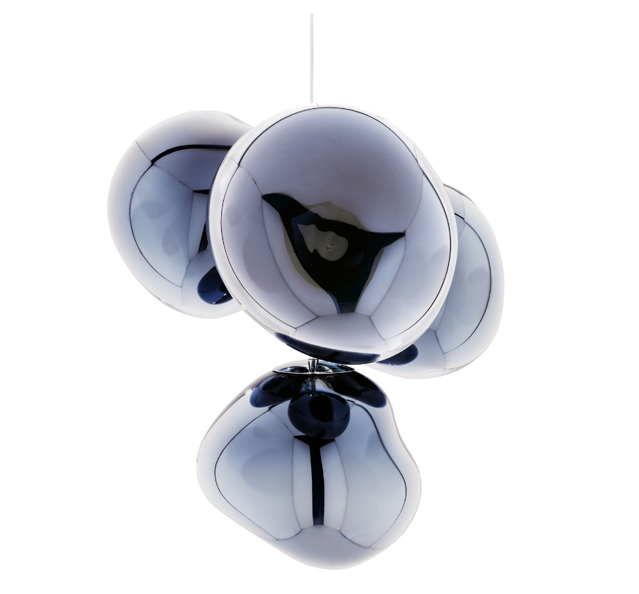 Der Melt ist eine dynamische Lichtskulptur, die aus sieben organischen, unregelmäßigen Kugeln besteht, die von einem zentralen Punkt aus strahlen und einen Effekt unendlicher Reflexionen erzeugen. Dieser moderne Kronleuchter bietet einen frischen Blick auf klassische Deckenbeleuchtung und verbindet die Ästhetik von geschmolzenem Glas mit innovativer Technologie.